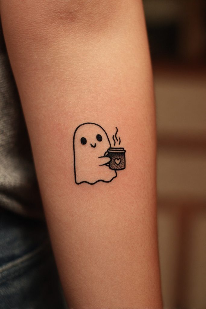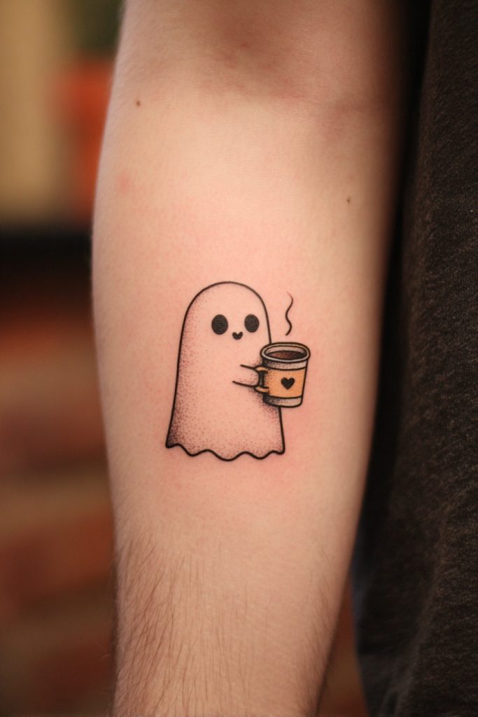 For the duo that cannot function without their morning caffeine ritual, a ghost holding a tiny steaming mug is a relatable and charming choice. This design celebrates the quiet moments spent together in local cafes or the long late-night conversations fueled by a fresh pot of coffee. It turns a mundane daily habit into a permanent symbol of companionship and shared energy. You can customize the mugs with small initials or even a tiny heart to make the piece feel more personal to your specific relationship. The contrast between the ethereal nature of the ghost and the grounded, cozy vibe of the coffee creates a whimsical piece of art. It is a perfect way for siblings or couples to acknowledge that their best moments often happen over a simple cup of something warm. This tattoo says that even in the afterlife, you would still be looking for a good latte together.