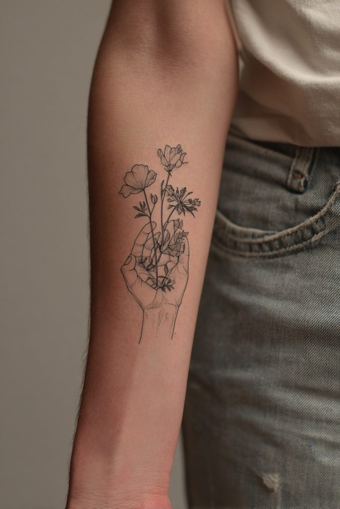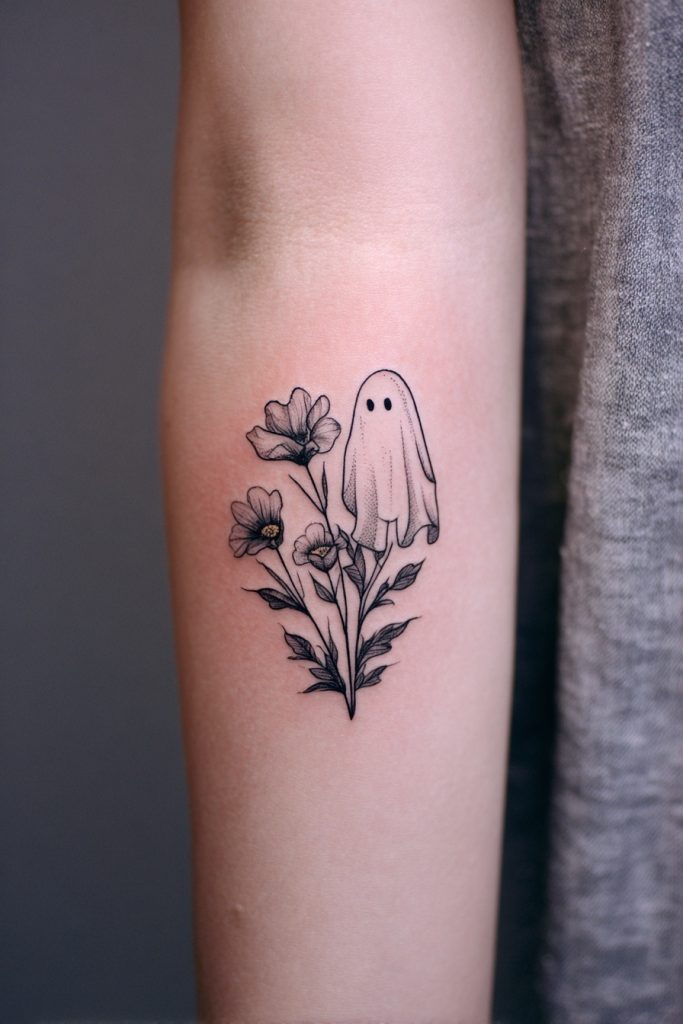 Merging the spooky with the botanical, these ghosts feature delicate wildflowers growing from within their translucent forms or being held in their tiny hands. This design represents the idea that even in endings, there is a beautiful new beginning and that love continues to bloom long after a season has passed. It is an especially popular choice for sisters or mothers and daughters who want a tattoo that feels feminine and artistic. The fine-line detail of the petals and leaves provides a sophisticated contrast to the bold, simple outline of the ghost. You can choose specific flowers that hold personal meaning, such as birth month blooms, to add a layer of hidden symbolism to the piece. This tattoo serves as a reminder that your relationship is a living, breathing entity that brings color and life into your world every single day.