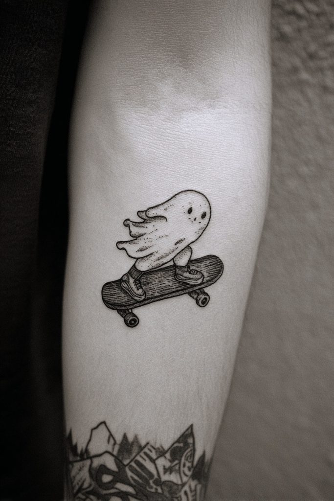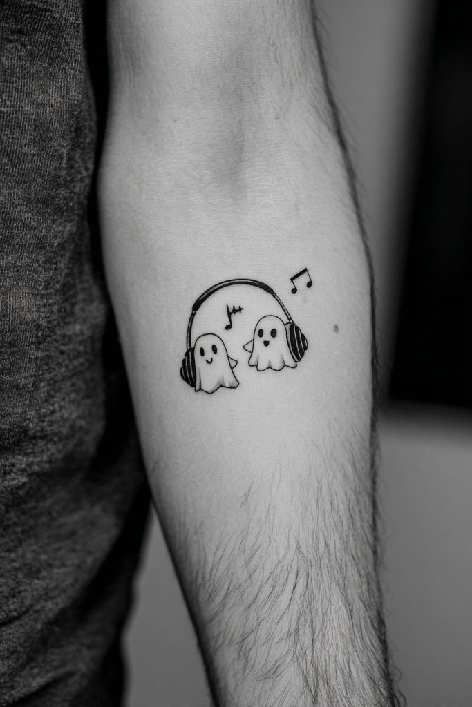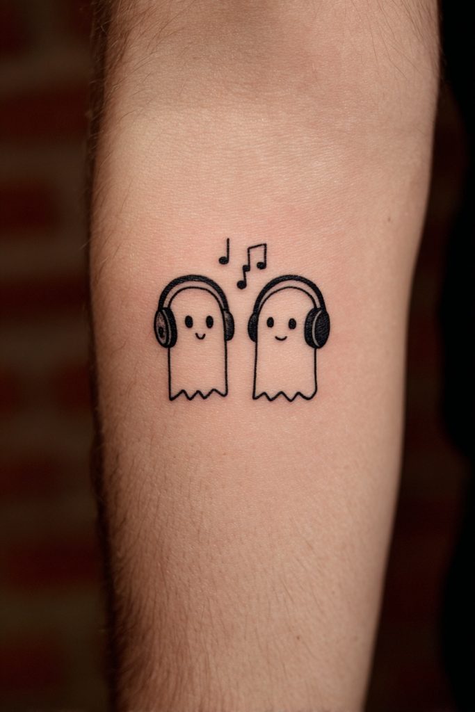 For the pair that is always sharing playlists or attending concerts together, ghosts wearing over-the-ear headphones are a modern and meaningful design. You can even include a tiny ‘sound wave’ or musical notes floating between the two ghosts to represent a specific song that defines your relationship. This tattoo acknowledges the role that music plays in connecting people and the way a certain melody can instantly bring back a shared memory. It is a perfect choice for friends who bond over their niche taste in indie bands or siblings who grew up listening to the same records. The headphones add a contemporary, relatable touch to the spiritual figure, making it feel rooted in the here and now. This ink ensures that even when the music stops, the connection between the two of you remains loud and clear, resonating through every chapter of your lives.