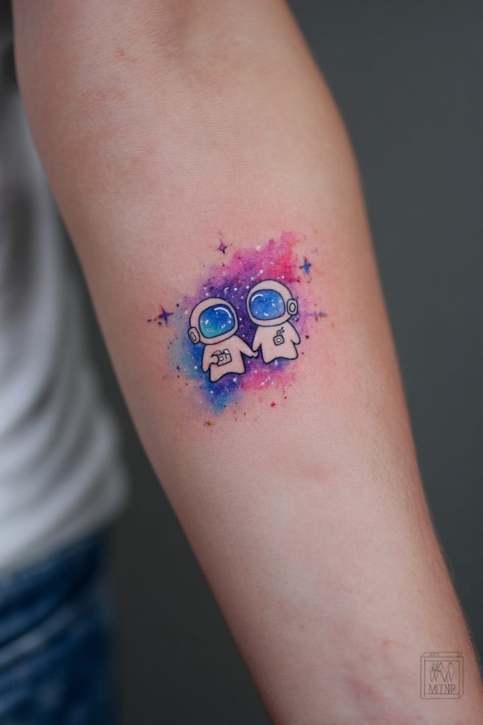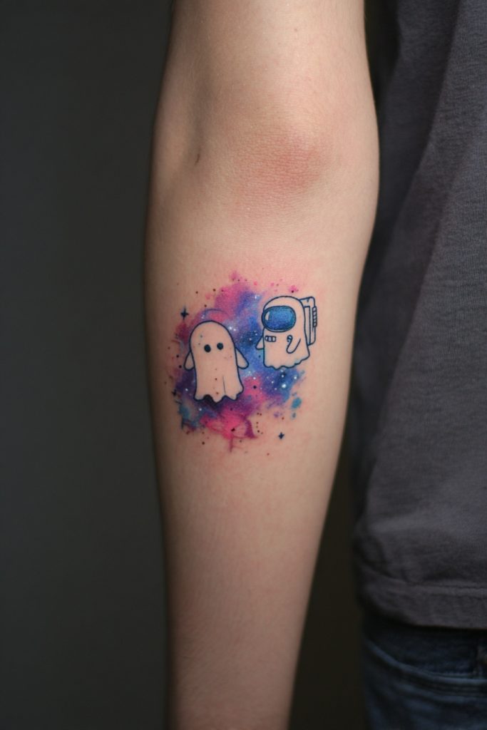 For the duo that feels like their connection was written in the stars, ghosts wearing astronaut helmets or floating through a miniature galaxy are a stunning choice. This design combines the mystery of the afterlife with the vastness of the universe, suggesting that your bond is cosmic in scale. The use of watercolor techniques can create a beautiful nebula effect around the ghosts, making the ink look like a piece of fine art. This is a great option for those who enjoy science fiction or who feel like they are both outsiders finding a home in each other. It represents an exploration of the unknown and the comfort of having a co-pilot for the journey through life. Whether you are navigating the Milky Way or just the complexities of adulthood, these space-bound spirits ensure you are always traveling together toward the next great frontier.