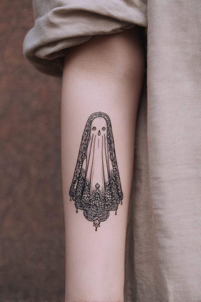 For the artistically inclined, a ghost rendered with intricate Victorian lace patterns or wearing an ornate period veil offers a sophisticated and gothic aesthetic. This design moves away from the ‘cute’ trend and leans into a more classical, macabre style of beauty. It is perfect for those who love history, literature, or the darker side of fashion. The level of detail required for the lace work makes this a true showpiece that reflects a deep appreciation for craftsmanship. For sisters or close friends with a shared love for the ‘dark academia’ vibe, these ghosts feel like they have stepped out of a classic ghost story. The elegance of the design ensures that it feels mature and timeless, serving as a hauntingly beautiful tribute to a relationship that has its own unique, storied history. It is ink that is as much about art as it is about the person you are sharing it with.