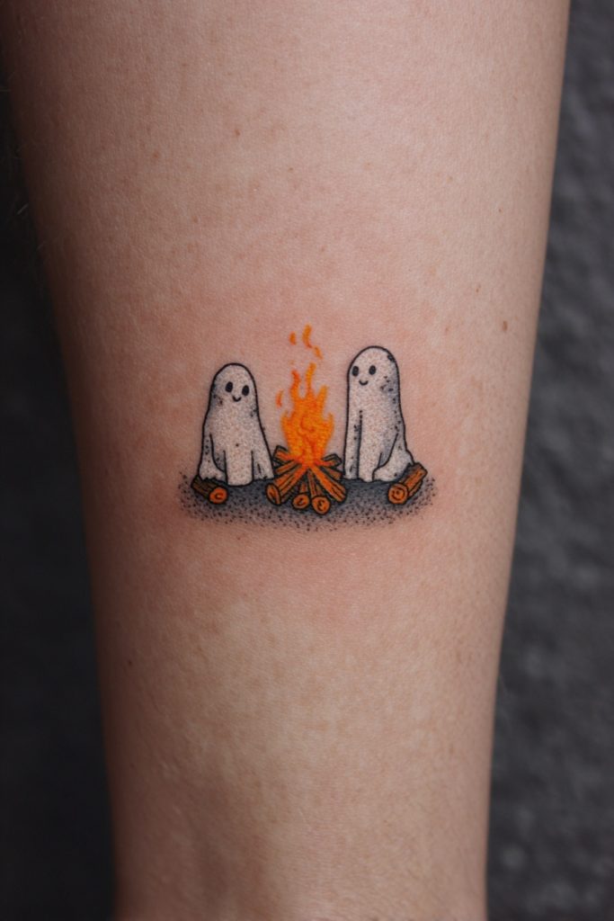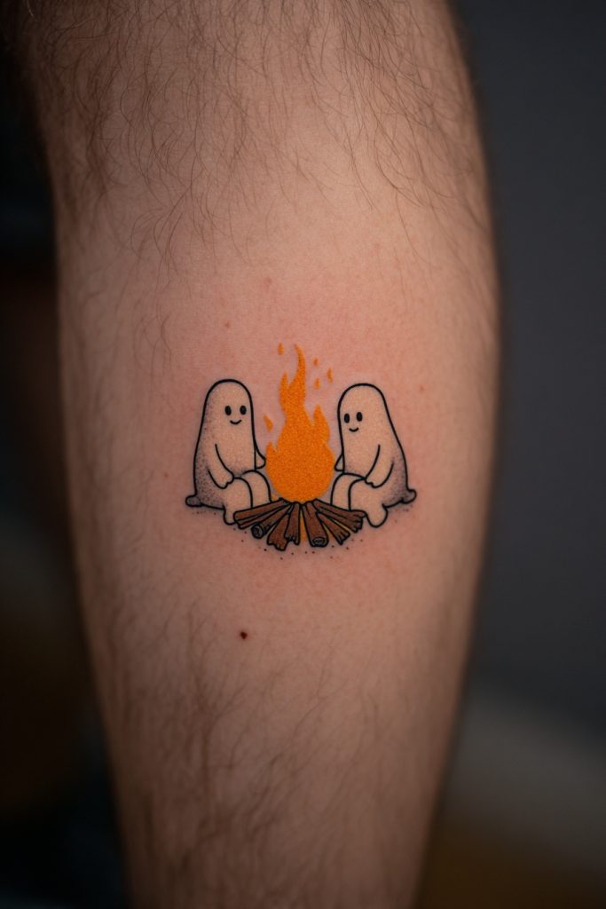 For the duo that loves nothing more than a night under the stars, ghosts sitting around a tiny, crackling campfire are a cozy and evocative design. This tattoo captures the warmth of shared stories, the smell of woodsmoke, and the peace of the wilderness. It is a fantastic choice for siblings who grew up camping together or friends who find their solace in nature. The orange and yellow flames provide a beautiful contrast to the white or grey of the ghosts, making the design pop against the skin. It represents a place of safety and warmth that you create for each other, no matter where you are in the world. This ink is a tribute to the quiet conversations and the deep reflections that only seem to happen when you are surrounded by the great outdoors. It ensures that the fire of your friendship never goes out.