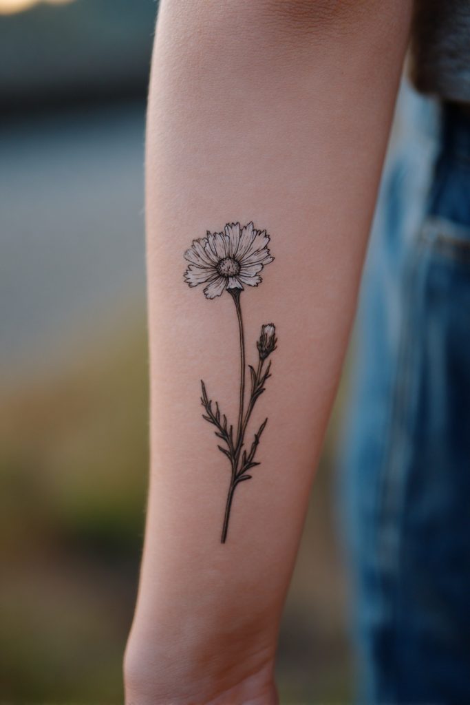 A single wildflower is a beautiful representation of resilience and the ability to thrive in even the most challenging or unexpected environments. Unlike garden flowers that require constant care and specific conditions, wildflowers grow freely and stubbornly, often pushing through cracks in the sidewalk or blooming in the middle of a vast field. This tattoo signifies a spirit that is untamed and independent, finding beauty in its own natural progression rather than conforming to external expectations. It is a perfect choice for someone who values their personal growth and the unique path they have carved out for themselves. The delicate petals and thin stem can be rendered with extreme precision, creating a look that is both feminine and incredibly sturdy, reflecting the multifaceted nature of the woman who wears it.