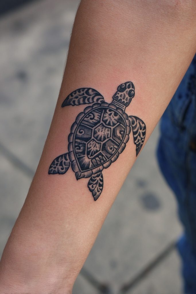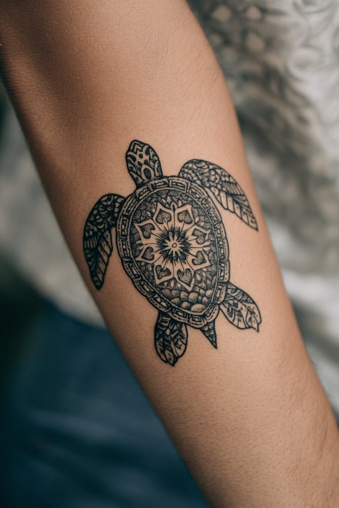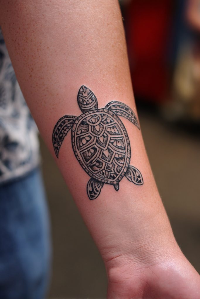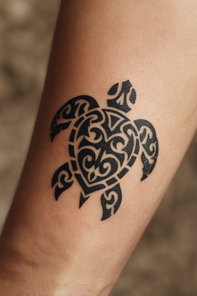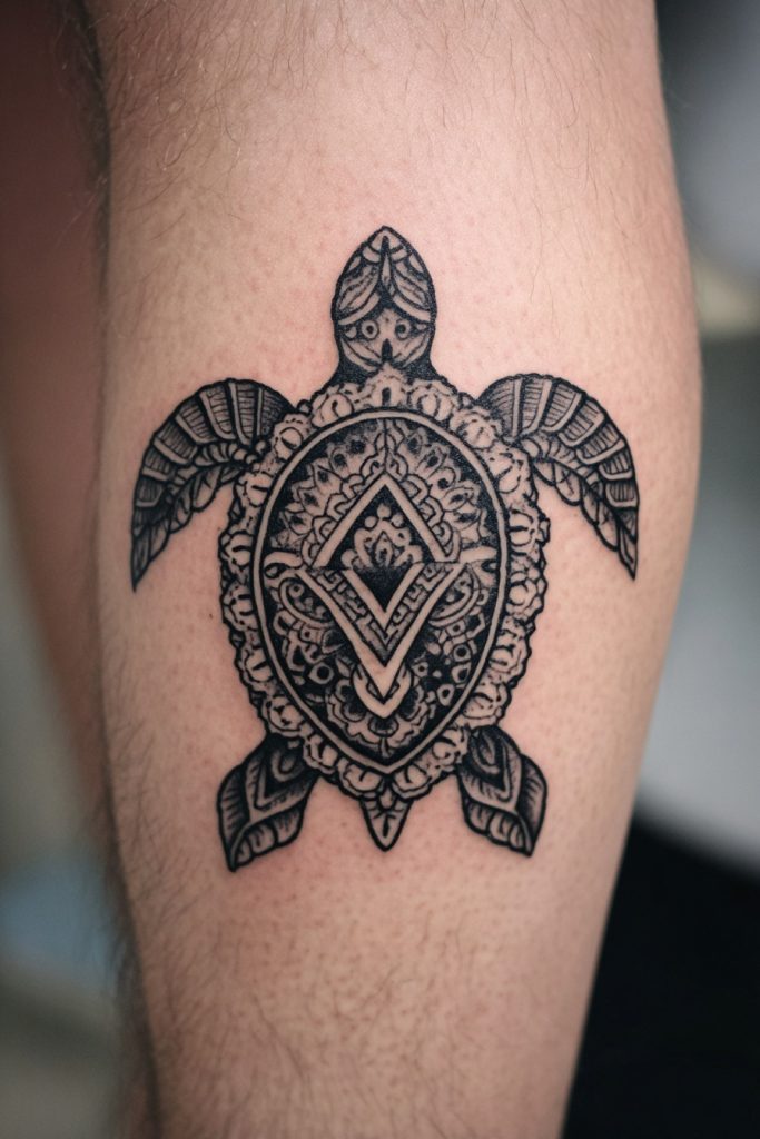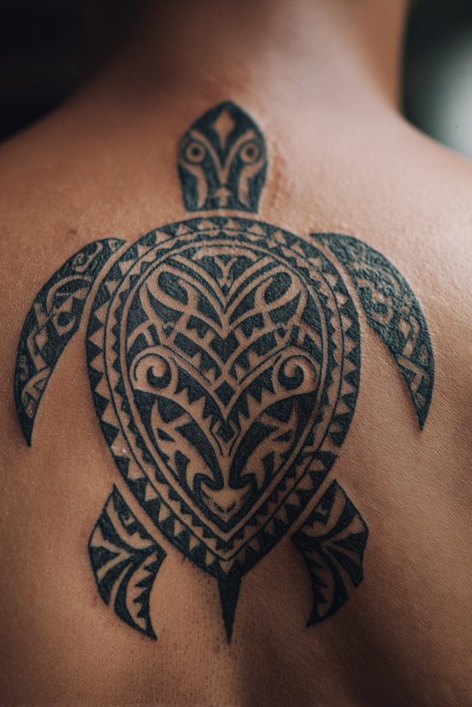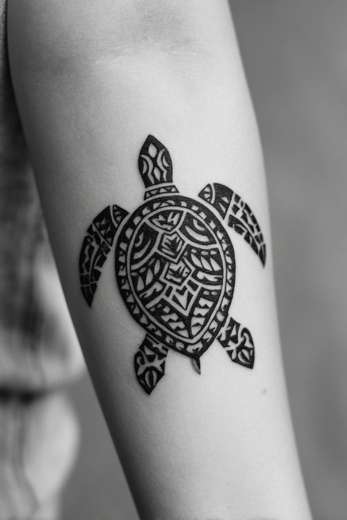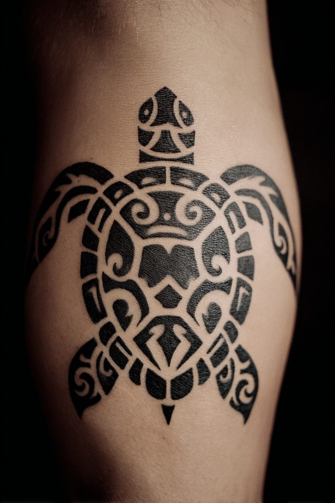 In Polynesian cultures, the sea turtle, known as the Honu, is a sacred symbol representing navigation, family, and the union between the physical and spiritual worlds. These designs utilize bold blackwork and intricate patterns that tell a specific story about the wearer’s heritage or personal journey across life’s many oceans. The shell is often filled with symbols like shark teeth or spearheads to signify protection, or waves to represent the ever-changing nature of the sea. This style is not just a tattoo; it is a spiritual talisman meant to guide the wearer safely home through any storm or uncertainty. It is a powerful choice for those who value their ancestral roots and want to carry a piece of ancient maritime wisdom with them wherever they go.