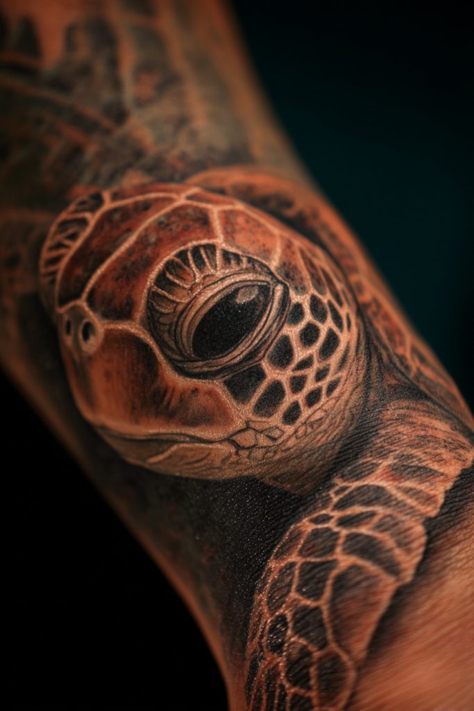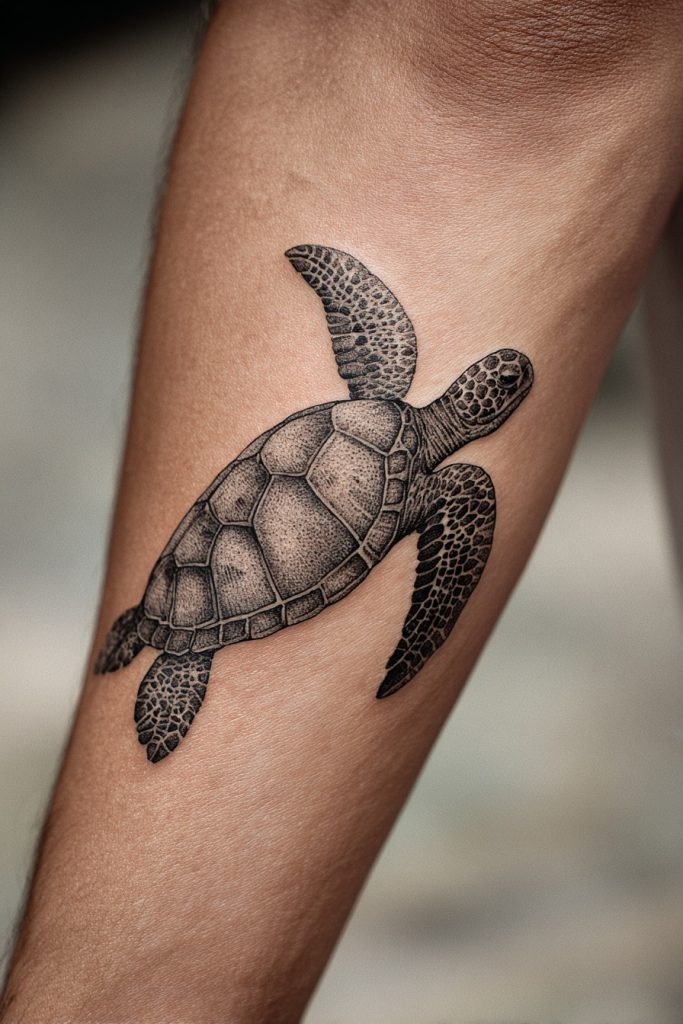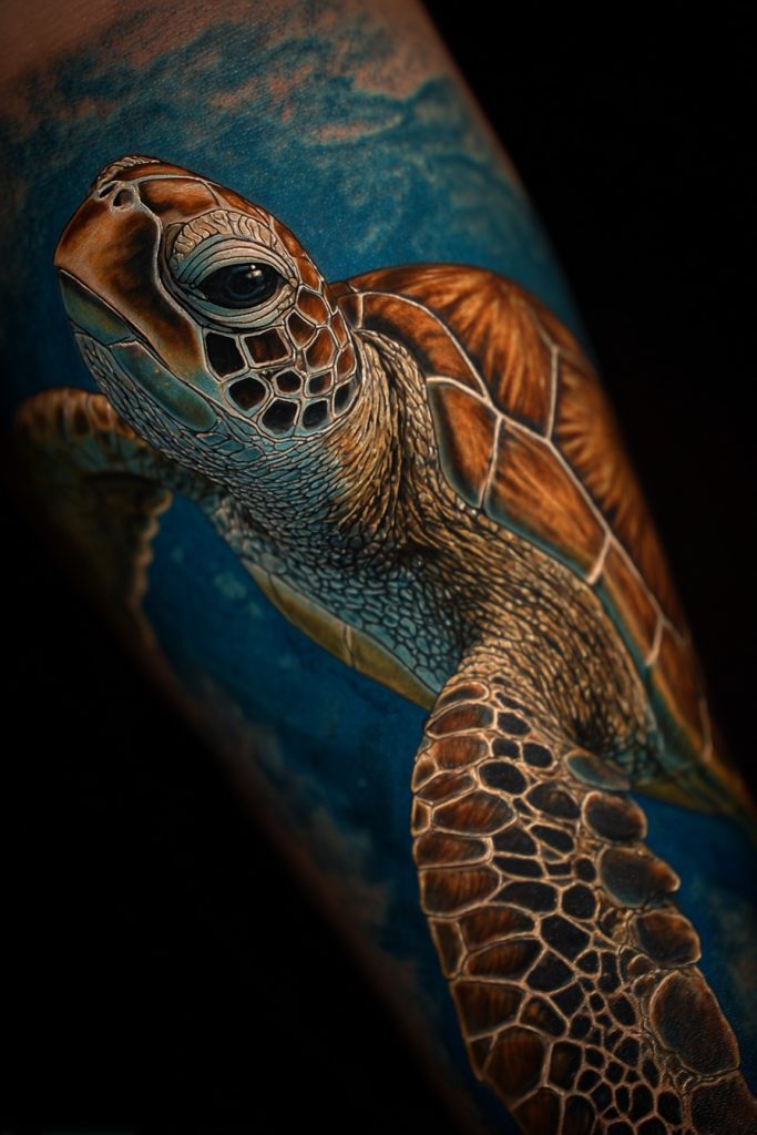 For the true nature lover who wants to capture the stunning biological detail of the species, a hyper-realistic portrait is the gold standard of tattoo art. This style focuses on the intricate texture of the turtle’s leathery flippers, the unique patterns on each scale of its head, and the wise, soulful expression in its large, dark eyes. A talented artist can use light and shadow to create the illusion of water shimmering across the shell, making the turtle appear as if it is truly swimming through the skin. This design symbolizes a deep, literal appreciation for the beauty of the natural world and a commitment to protecting the fragile ecosystems that these creatures call home. It is a striking and honest representation of the quiet power that exists within the depths of the ocean.