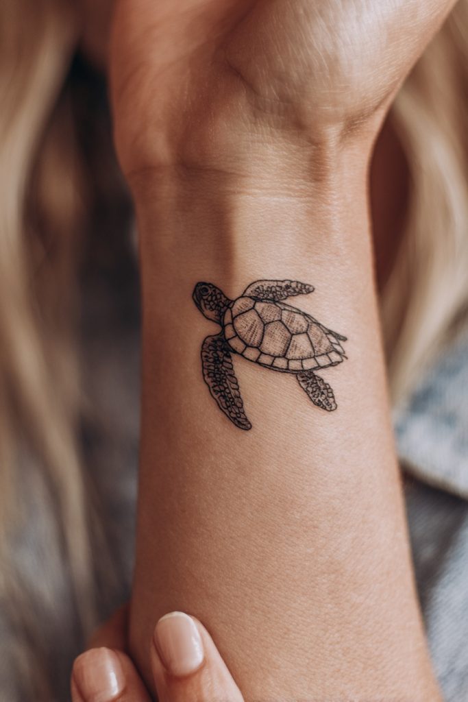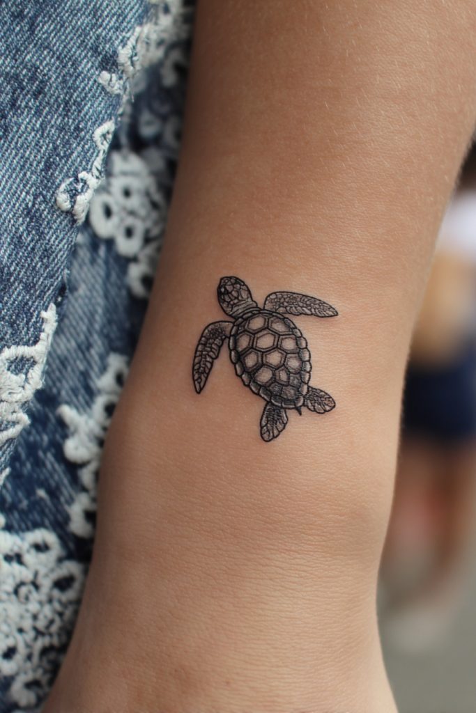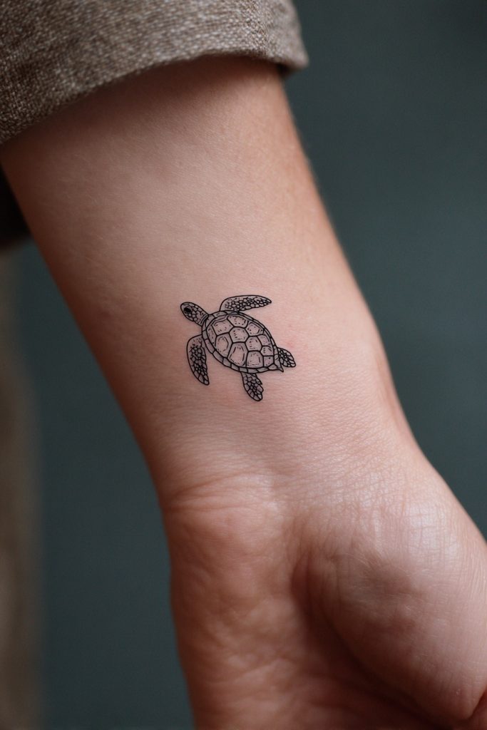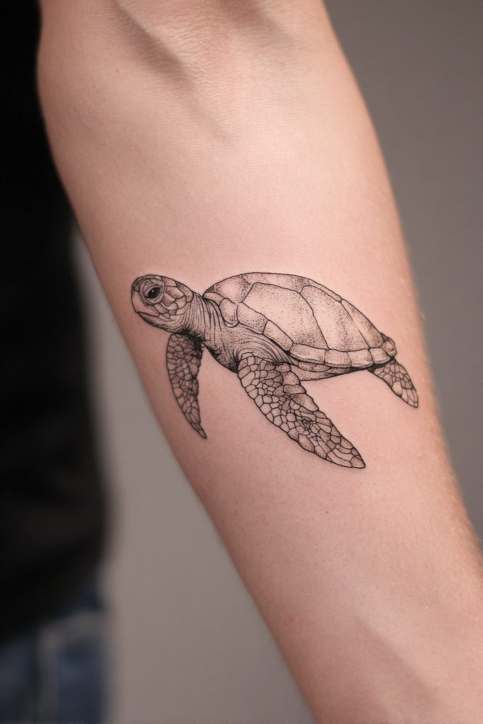 If you prefer a more subtle and elegant nod to your love for the ocean, a minimalist fine-line sea turtle is an excellent choice that works beautifully in almost any placement. By stripping away the heavy shading and focusing on the iconic shape of the turtle in motion, you create a piece that feels light, airy, and timeless. This style represents a quiet confidence and a personal connection to nature that does not require a large or loud display to be meaningful. It is a sophisticated way to carry a reminder of patience and serenity with you during the busy, often chaotic moments of daily life. These tattoos are perfect for smaller areas like the wrist or behind the ear, acting as a private anchor for your spirit and your intentions.