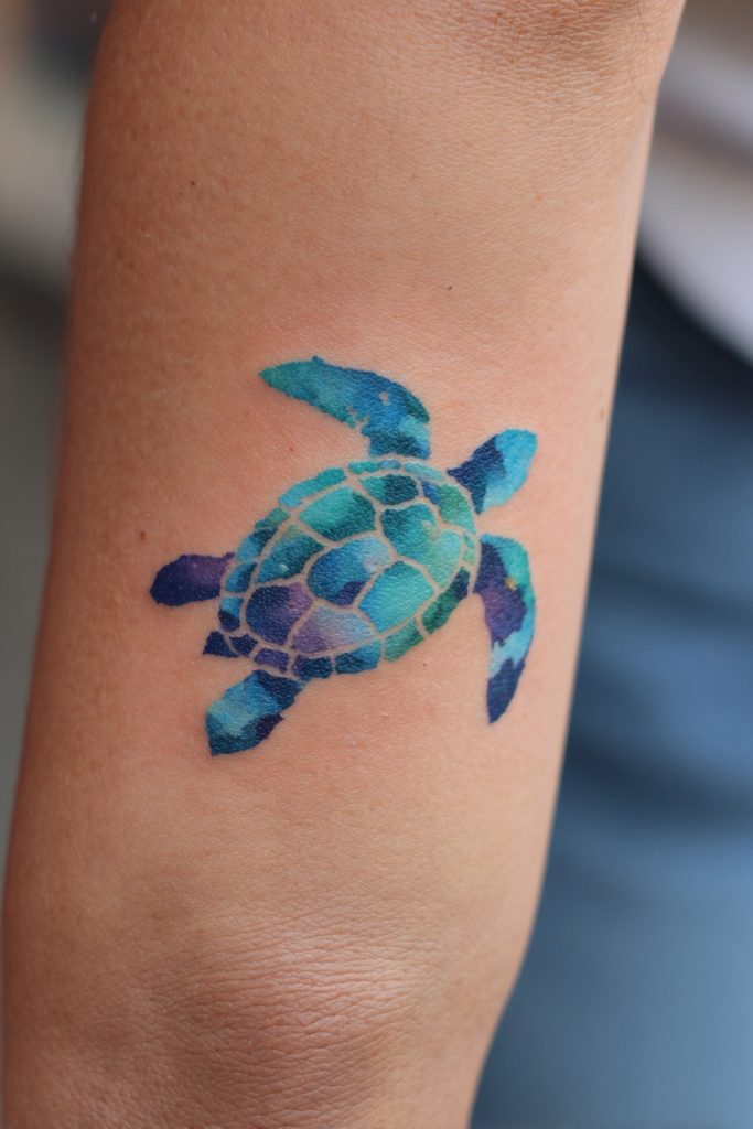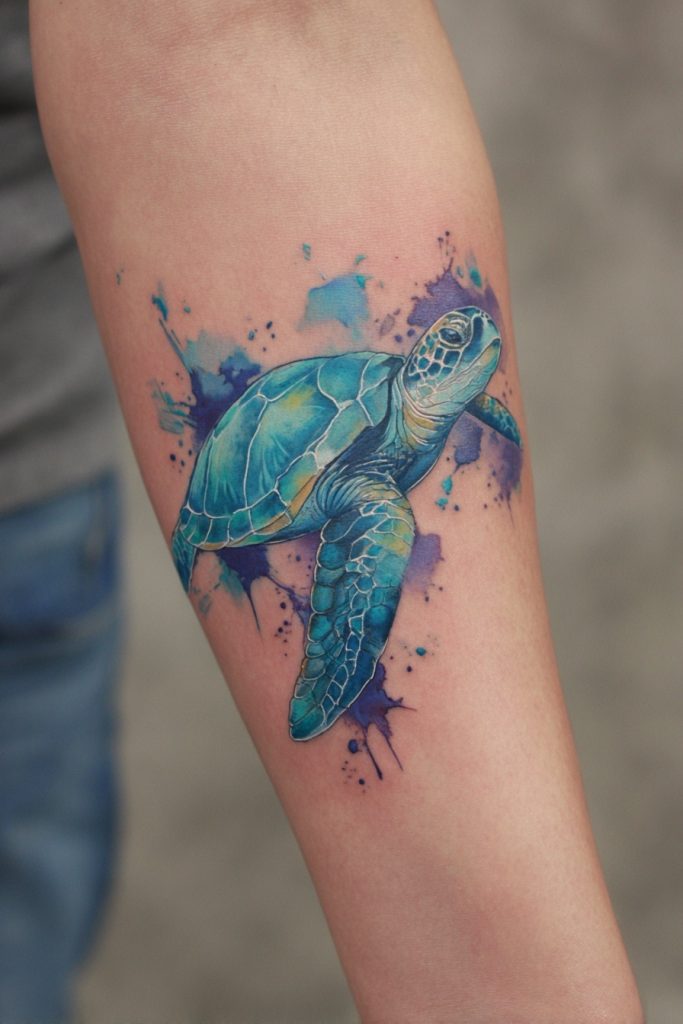 The watercolor style is a natural fit for sea turtle tattoos because it perfectly mimics the fluid, ever-changing colors of the tropical waters where these creatures thrive. By using soft washes of turquoise, emerald, and deep indigo that bleed beyond the lines of the turtle’s body, the design captures a sense of freedom and artistic motion. This approach symbolizes the beauty of going with the flow and embracing the unpredictability of life’s currents without losing your sense of direction. It is a joyful and vibrant celebration of the sea, making the tattoo feel more like a painting than a traditional mark on the skin. For someone who sees their life as a colorful adventure, a watercolor turtle is a visually stunning way to express that creative and resilient spirit.