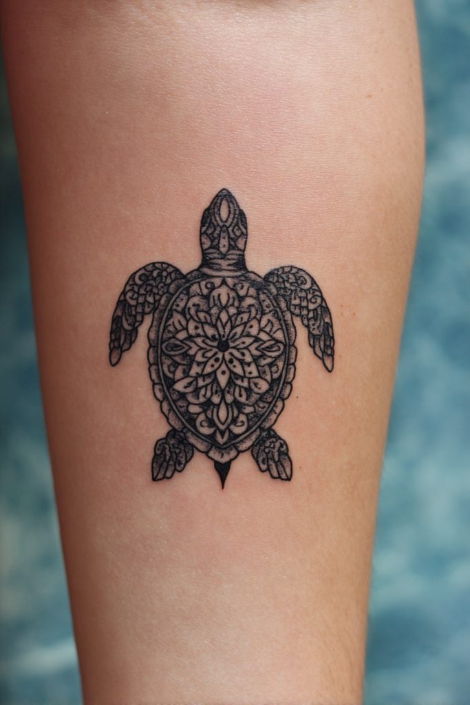 Integrating sacred geometry or intricate mandala patterns into the shell of a sea turtle adds a layer of spiritual and intellectual depth to the piece. The turtle’s shell is already a marvel of natural symmetry, and by filling it with patterns like the flower of life or expanding lotus petals, you highlight the connection between nature and the universal laws of order. This style symbolizes the idea that our personal journeys are part of a larger, divine pattern that connects all living things across time and space. It represents a mind that seeks balance and harmony, recognizing that even the slowest journey is guided by a higher purpose and a deep internal wisdom. This is a perfect choice for those who view their connection to the ocean as a spiritual path toward enlightenment.