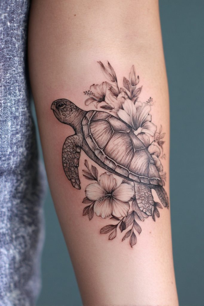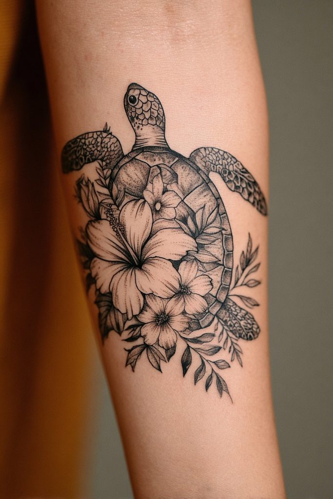 Blending a sea turtle with various floral elements creates a design that celebrates the interconnectedness of all life on earth, from the deep sea to the forest floor. By replacing or decorating the shell with blooming hibiscus, lilies, or even succulents, you create a piece that symbolizes growth, fertility, and the flourishing of the soul. This style represents a person who is deeply nurturing and finds strength in the beauty and fragility of the natural world. It is a soft and feminine take on a traditionally powerful symbol, suggesting that resilience can be found in grace and gentleness just as much as in armor. This tattoo is a beautiful reminder that no matter where our travels take us, we carry the seeds of our own growth and our own home within ourselves.