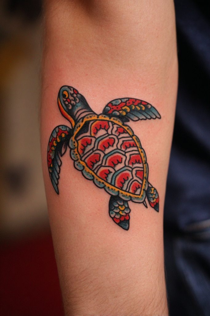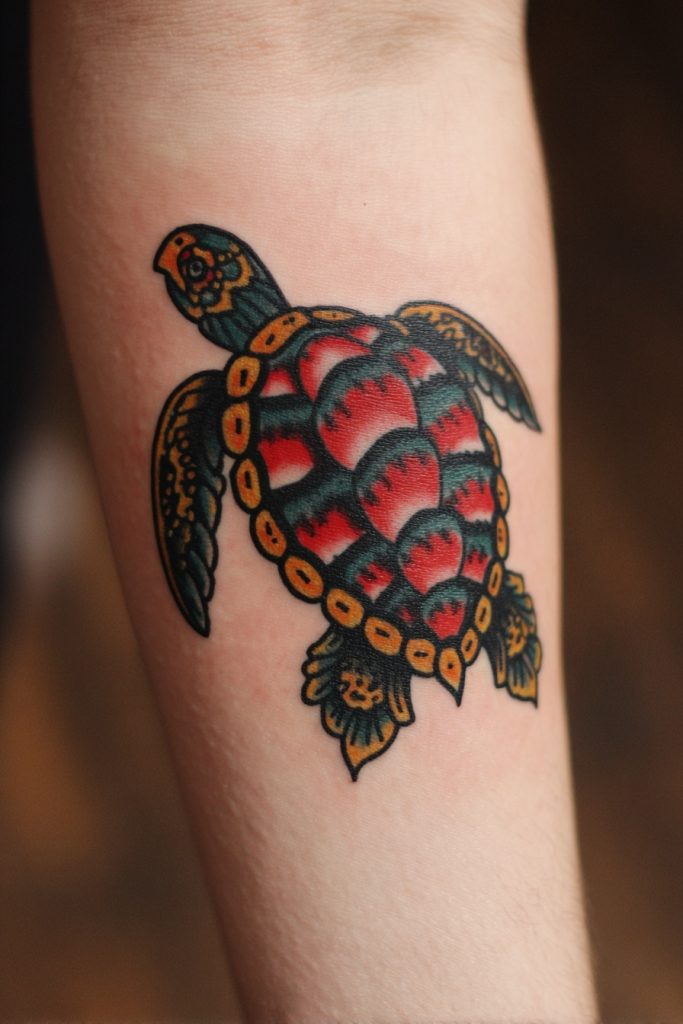 The American traditional style, with its bold black outlines and a primary color palette, brings a rugged and nostalgic feel to the sea turtle symbol. In early maritime culture, sailor tattoos were often earned as badges of honor after achieving certain milestones, such as crossing the equator or surviving a long and treacherous voyage. A turtle in this style often features bright reds, yellows, and greens, standing out as a clear and unmistakable mark of a seasoned traveler who has weathered many storms. This design represents a no-nonsense approach to survival and a deep respect for the traditions of those who have explored the sea before us. It is a timeless and sturdy choice for someone who values loyalty, grit, and the enduring strength of the classic sailor spirit.