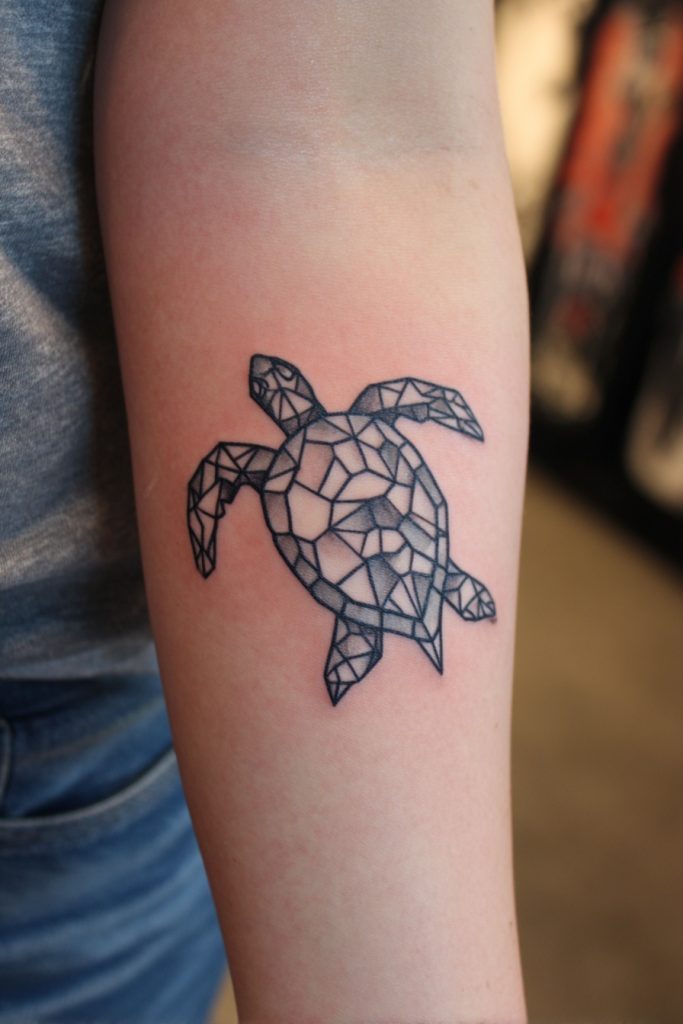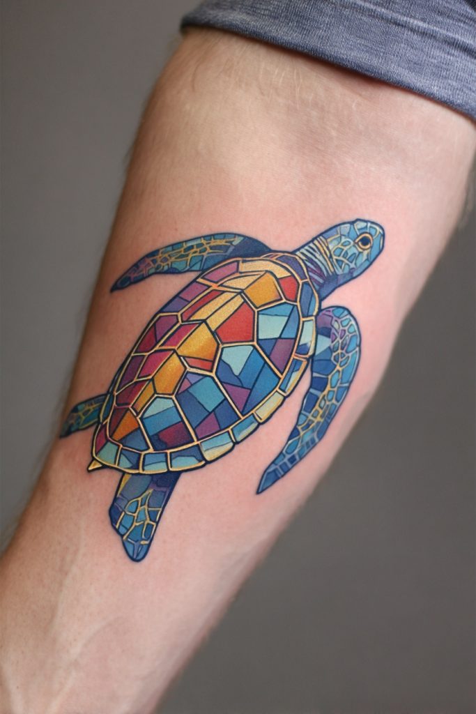 For a modern and unconventional take on the symbol, an abstract mosaic sea turtle uses sharp angles and fragmented shapes to create a sense of reconstructed strength. This design can represent a person who has been through difficult times, feeling as though they were broken into pieces, only to rebuild themselves into something even more beautiful and resilient. The mosaic style allows for a playful use of color and light, making each section of the turtle feel like a unique piece of a larger puzzle. It is a metaphor for the way our varied experiences, both the good and the bad, come together to form our complete identity. This tattoo is a celebration of the healing process and the incredible ability we have to remain whole even when life feels fragmented and complex.