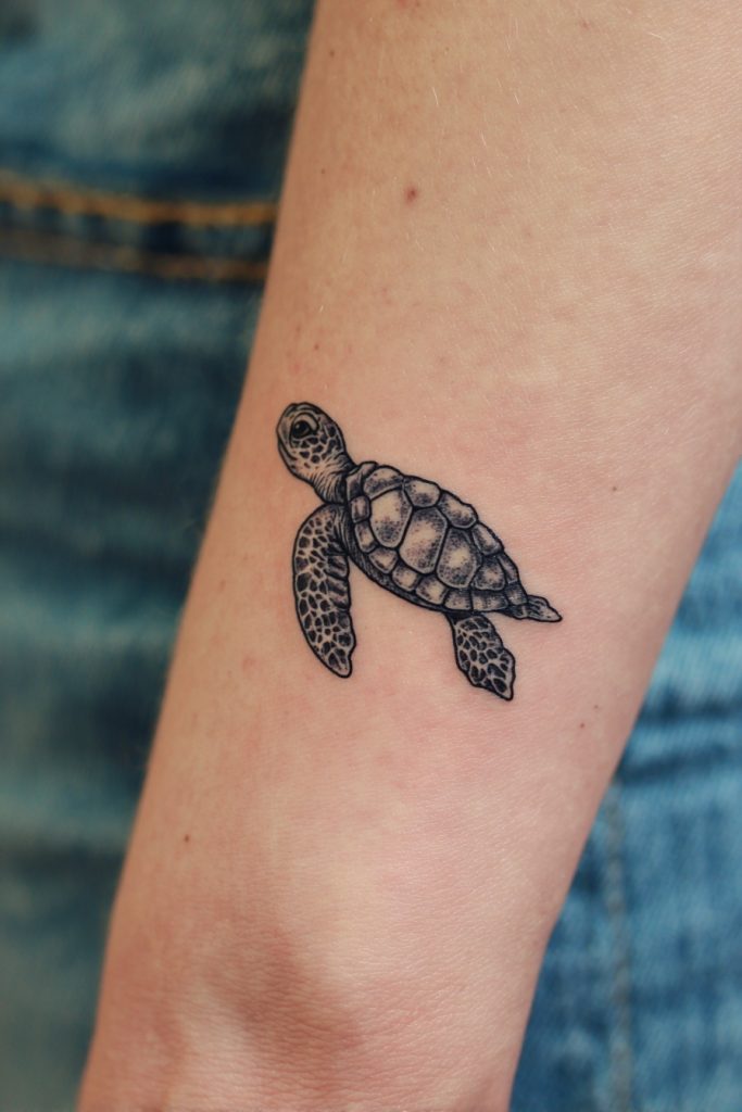 A tattoo depicting a tiny baby sea turtle making its first, courageous crawl toward the ocean is one of the most poignant symbols of survival and hope. Against all odds, these hatchlings must navigate a dangerous beach to reach the safety of the waves, representing the beginning of a long and difficult journey where success is never guaranteed. This design is perfect for someone who has recently started a new chapter in their life or has overcome a significant obstacle that once felt insurmountable. It symbolizes the raw instinct to survive and the incredible bravery required to take that first step into the unknown. A hatchling tattoo is a small but powerful reminder that every great journey begins with a single, determined effort to reach the horizon.