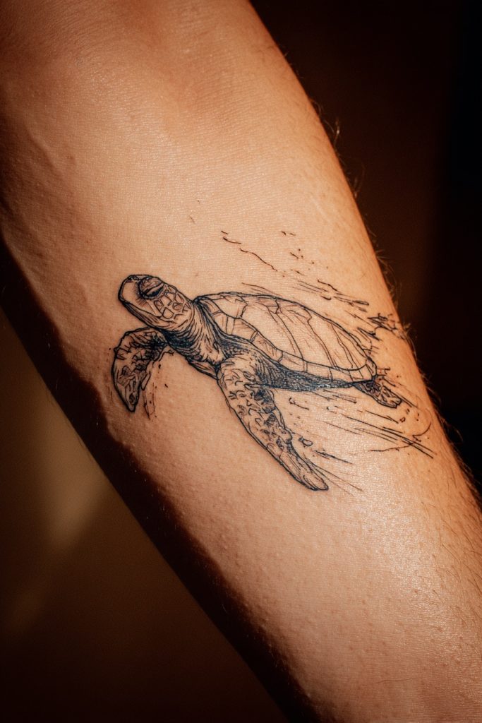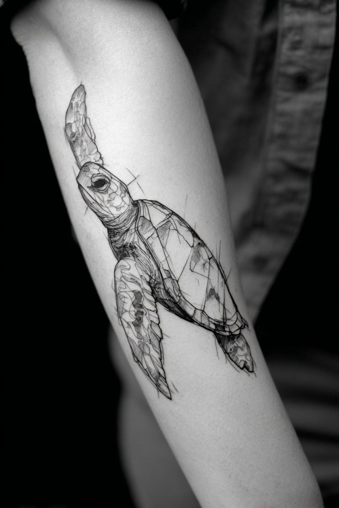 An illustrative or sketchy sea turtle tattoo uses loose, expressive lines and intentional cross-hatching to create a sense of raw energy and constant motion. Instead of a static image, this style looks as if it were pulled directly from an artist’s sketchbook, capturing the turtle in the middle of a powerful stroke through the water. This represents a life lived with passion and a refusal to stay stagnant or stuck in one place for too long. It is an artistic and dynamic choice for those who value the process of creation and the beauty of the unfinished or imperfect. A sketchy turtle tattoo suggests that you are a work in progress, always moving forward and always learning from the currents that carry you through each new day.