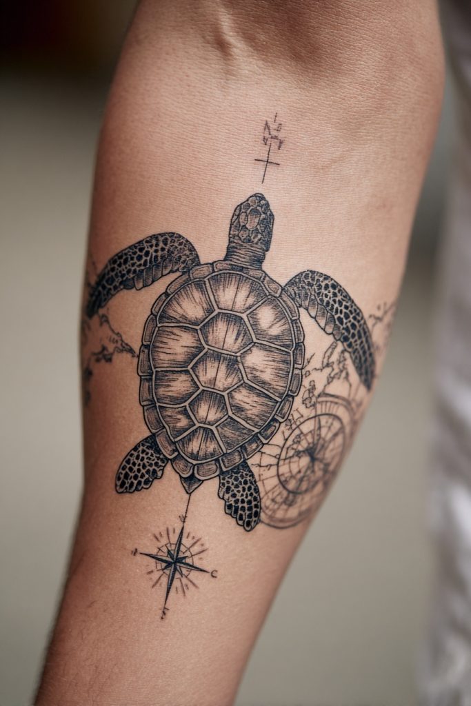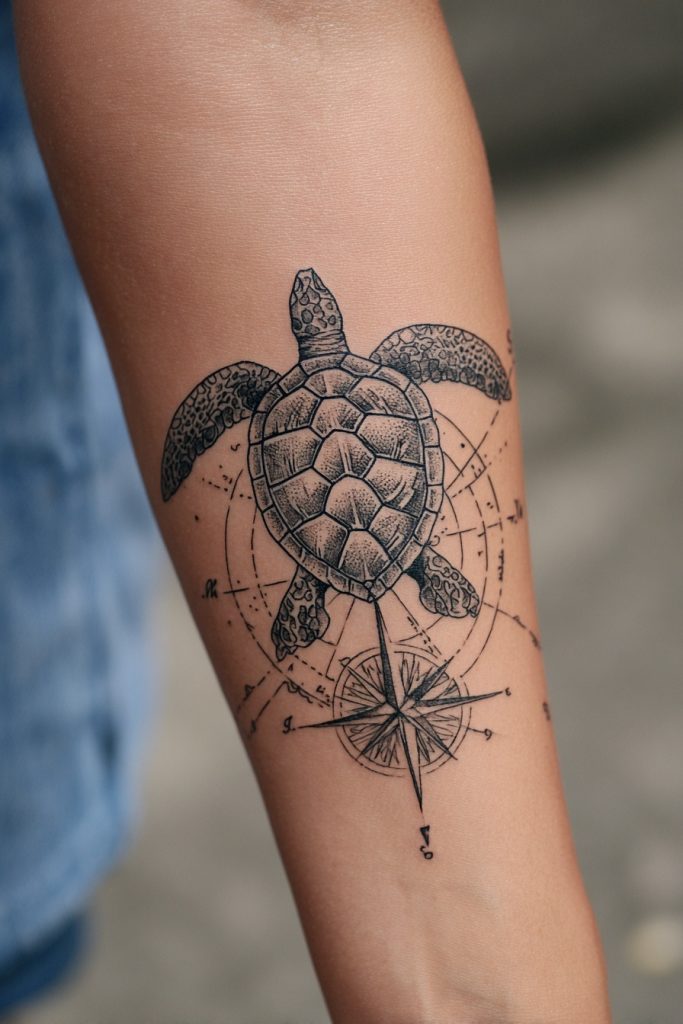 Combining a sea turtle with a nautical compass or an old-world map creates a powerful narrative about finding your way through the unknown and staying true to your inner north. This design symbolizes the turtle’s incredible biological ability to navigate thousands of miles back to the exact beach where it was born, a feat that still baffles and inspires scientists today. It is a perfect choice for the traveler, the nomad, or the person who has spent a long time searching for their place in the world. The addition of navigation tools reinforces the idea that you have the skills and the instinct to find your way home, no matter how vast the ocean or how difficult the journey. This tattoo is a badge of honor for anyone who has successfully navigated their own life to find a sense of true belonging.