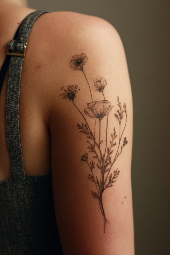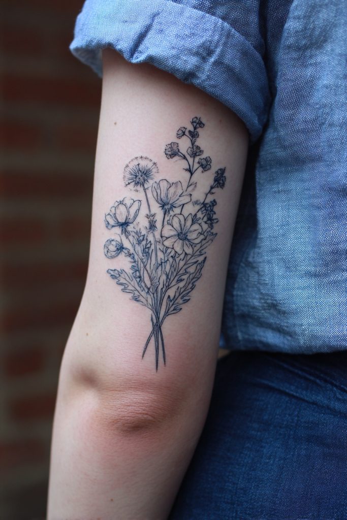 A delicate wildflower bouquet is a timeless choice for a reason, representing the untamed and diverse beauty of a spirit that refuses to be manicured or contained. Unlike a formal garden, wildflowers grow wherever they find a patch of sunlight, thriving in the most unexpected places with a quiet but stubborn resilience. This tattoo can incorporate various species, each with its own meaning, from the tenacity of the dandelion to the fleeting elegance of the poppy. The arrangement can be loose and organic, trailing along a forearm or tucked behind a shoulder, serving as a constant reminder that beauty does not have to be perfect or orderly to be breathtaking. It is a celebration of individuality and the freedom to grow wild, capturing the essence of a summer meadow in a permanent, artistic form that feels both feminine and incredibly strong.
