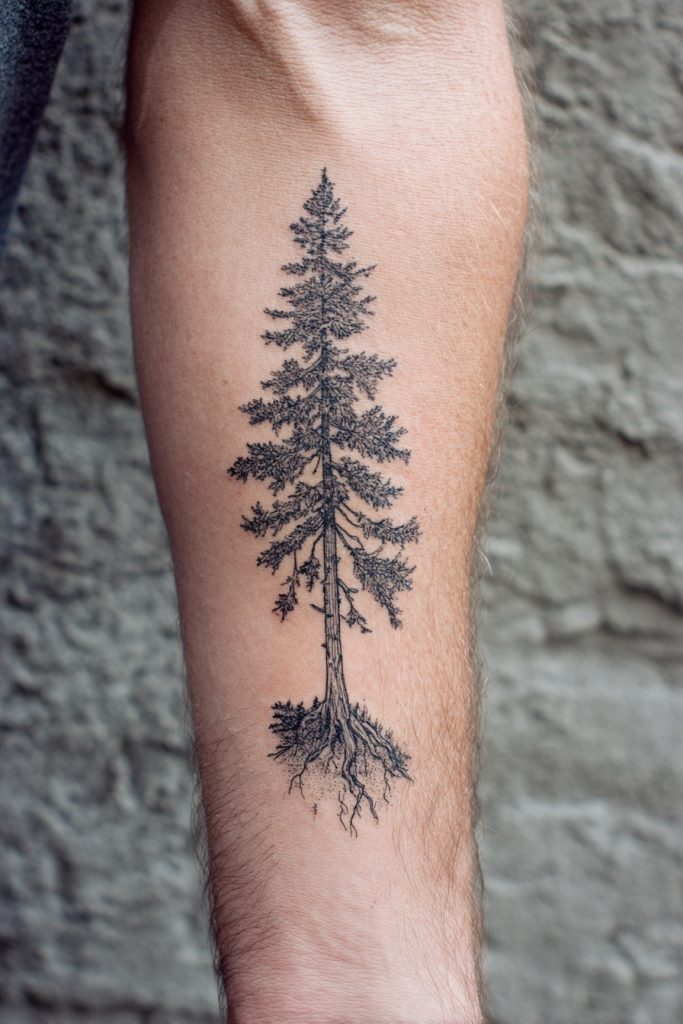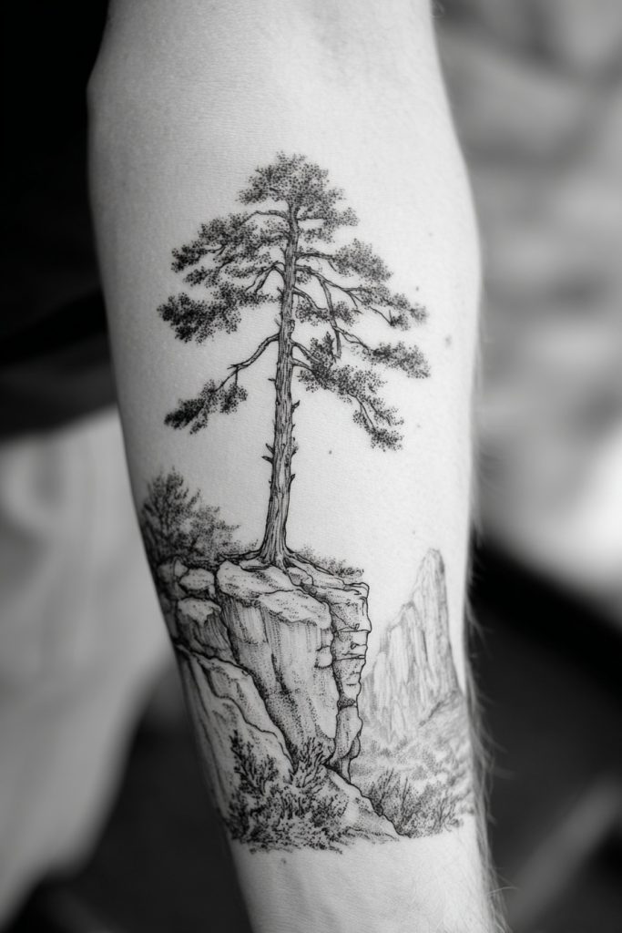 The stately lone pine is a powerful symbol of endurance and the ability to stand tall even in the harshest of environments. Pines are known for their evergreen nature, maintaining their vibrancy throughout the coldest winters and the most punishing storms, which makes them a beautiful metaphor for human resilience. As a tattoo, a single, detailed pine tree represents a person who is self-sufficient and grounded, finding peace in solitude and strength in their own roots. This design often utilizes fine line work to capture the intricate texture of the needles and the rugged bark, creating a piece that feels both realistic and deeply symbolic. It is an ideal choice for someone who values their independence and has navigated the difficult terrains of life with a steady, unyielding spirit. This tattoo acts as a personal landmark, reminding the wearer of their own capacity for survival.