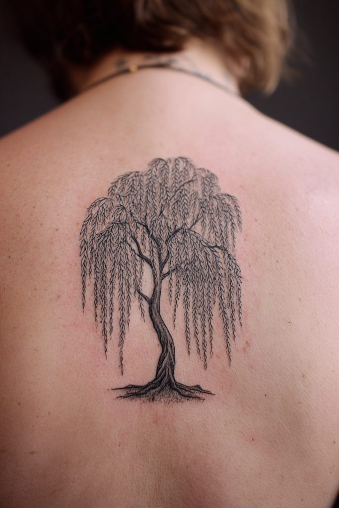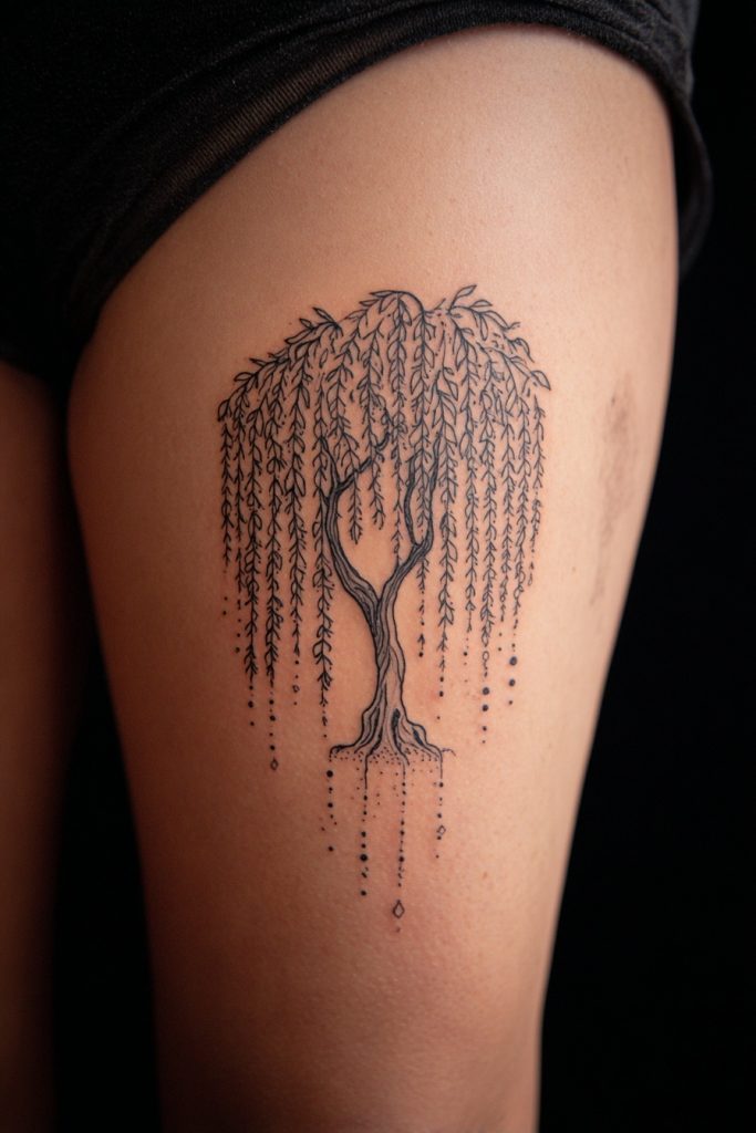 The weeping willow is a tree that embodies the perfect balance of flexibility and strength, known for its ability to bend in the wind without breaking. Its long, flowing branches create a sense of movement and sorrowful beauty that makes for a stunning, large-scale tattoo on the back or thigh. This tree is often associated with the processing of emotions, the healing power of water, and the wisdom that comes from life experience. Having a willow on your skin serves as a reminder that being soft and adaptable is not a weakness, but a vital survival strategy. The delicate leaves can be rendered with soft shading to create a dreamlike effect, suggesting a connection to the subconscious and the fluid nature of time. It is a deeply poetic design for anyone who has learned to flow with the changes of life rather than fighting against them.