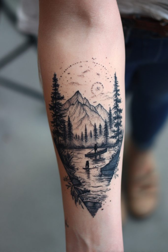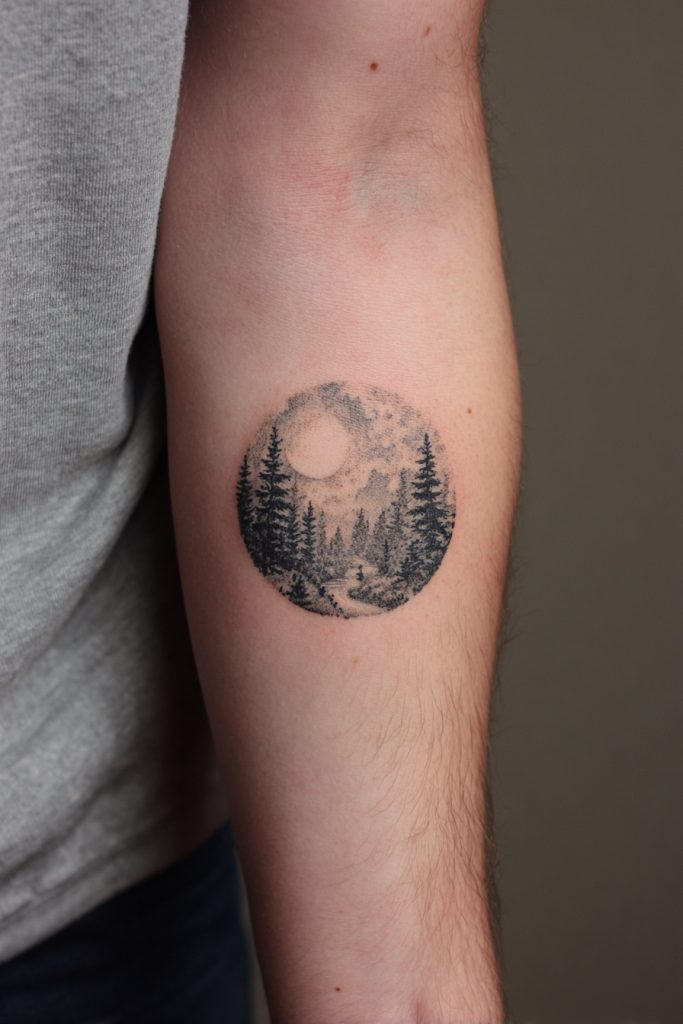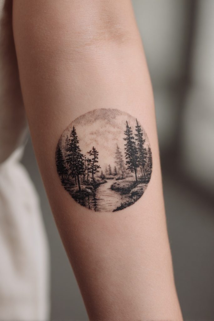 If you cannot choose just one element of nature, a miniature forest scene allows you to capture an entire ecosystem in a single, cohesive design. These tattoos often take a circular or diamond-shaped form, acting as a window into a secret woodland world complete with trees, a winding stream, and perhaps a small animal or a night sky. This style is perfect for those who feel a deep sense of belonging in the woods and want to carry that sanctuary with them at all times. The level of detail in these small scenes is often incredible, requiring a skilled artist to manage the perspective and shading. It serves as a personal ‘escape’ that you can look at whenever you feel overwhelmed by the concrete world, reminding you that the forest is always there, waiting for your return to its quiet and restorative embrace.