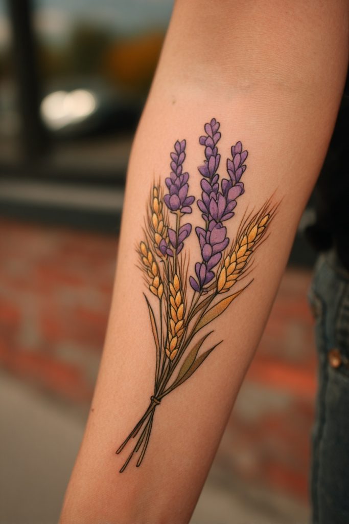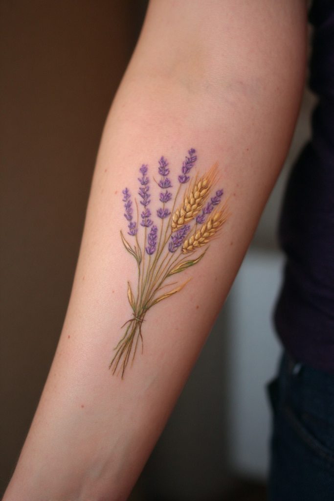For a tattoo that evokes the feeling of a sun-drenched countryside and a simpler way of life, a bundle of lavender and wheat is a soft and meaningful choice. Lavender is traditionally associated with silence, devotion, and serenity, while wheat represents abundance, the harvest, and the cycle of life. Together, they create a design that feels incredibly peaceful and grounded, suggesting a person who values the quiet moments and the fruits of their labor. This style often uses soft purples and golden yellows, creating a warm and inviting piece of art. It is a beautiful way to honor a connection to the land or a memory of a place where you felt truly at home. This tattoo is like a permanent dried bouquet, carrying the scent of summer and the promise of a bountiful life wherever you go.