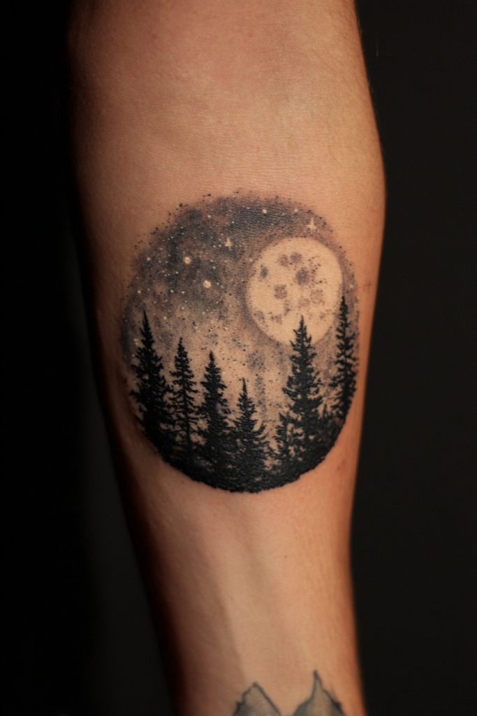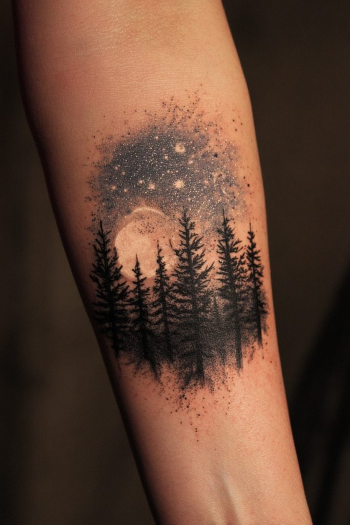 Combining the terrestrial beauty of a pine forest with the infinite wonder of the night sky creates a tattoo that speaks to our place in the cosmos. This design often features a silhouette of trees in the foreground, with a detailed galaxy, stars, or a full moon filling the space above them. It represents the intersection of the known and the unknown, and the feeling of awe that comes from standing under a clear, dark sky. This tattoo is a reminder that while we are grounded on the earth, our spirits are part of something much larger and more mysterious. The contrast between the solid, dark trees and the bright, shimmering stars creates a visually stunning piece that feels both expansive and intimate. It is a tribute to the explorers, the dreamers, and those who find their true selves under the light of the stars.