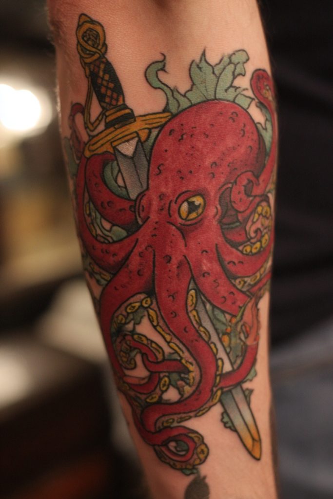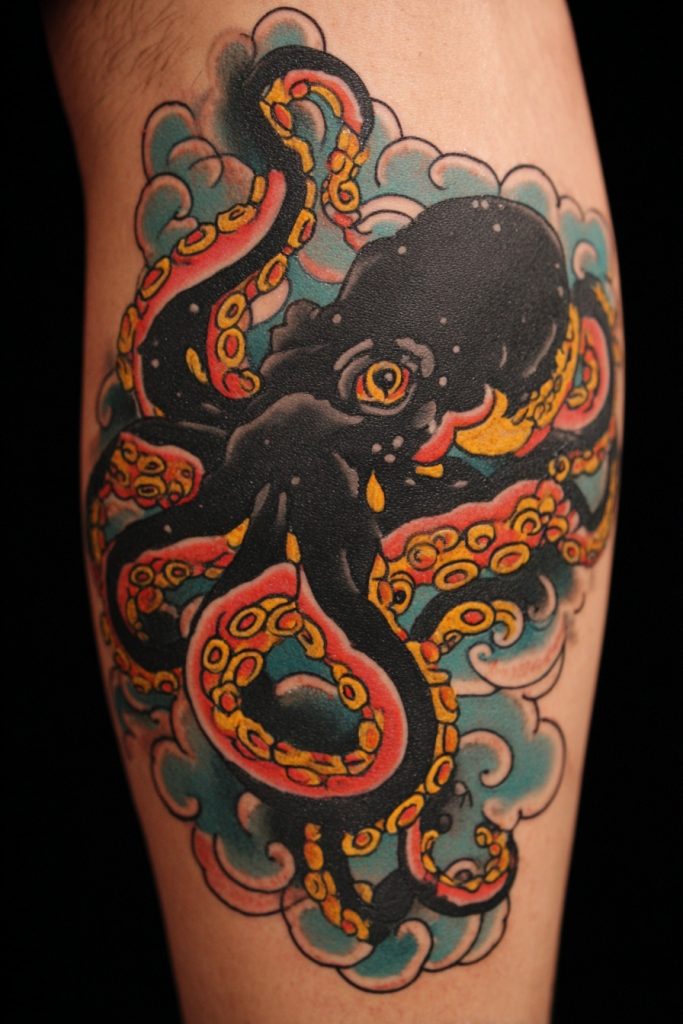 Neo-traditional octopus tattoos take the classic elements of old-school art and infuse them with a more modern, illustrative flair that allows for incredible personality and detail. These designs often feature decorative elements like sunken treasure, ornate daggers, or lush underwater flora to create a complete and compelling narrative within the piece. The use of varied line weights and a rich, saturated color palette makes the octopus feel almost like a character from a high-fantasy novel or a maritime myth. This style is excellent for those who want their tattoo to tell a story of adventure and the pursuit of the unknown, showcasing their own bold approach to life’s many challenges. It is a fun and visually impactful way to wear your strength and your love for the mysterious on your skin.