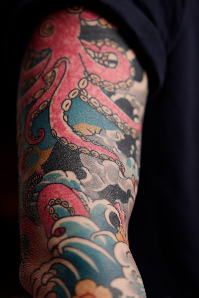 In the rich tradition of Japanese tattooing, the octopus is often depicted as a powerful and slightly mischievous creature that weaves through crashing waves and swirling clouds. These designs typically feature bold black outlines and a vibrant use of color, with the tentacles wrapping dynamically around the wearer’s limbs to create a sense of constant motion. This style often draws on ancient folklore, where the octopus is seen as a symbol of abundance and a guardian of the ocean’s hidden treasures. By choosing an Irezumi-style piece, you are connecting yourself to a long history of maritime storytelling and artistic mastery that emphasizes the raw power of the natural world. It is a fantastic choice for a large-scale project, such as a back piece or a full sleeve, where the intricate flow of the tentacles can be fully appreciated in all its glory.