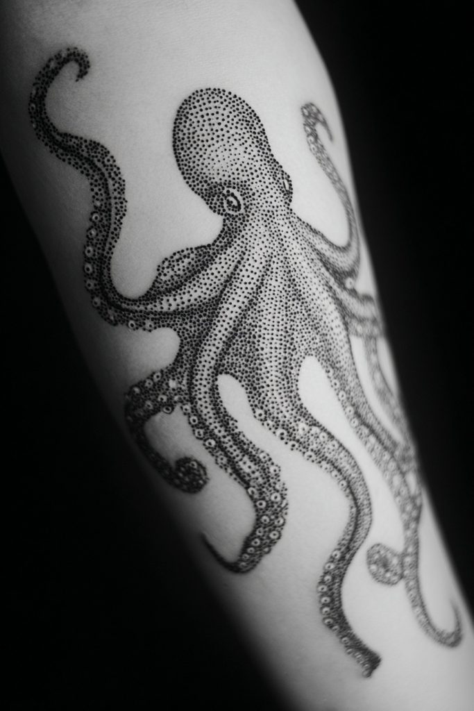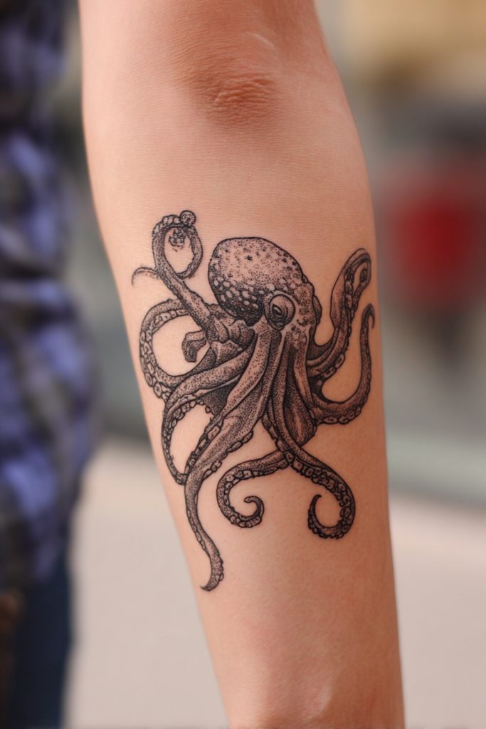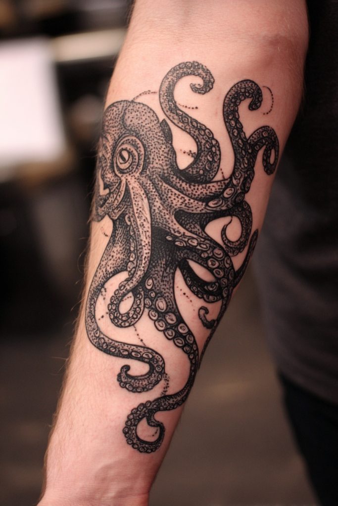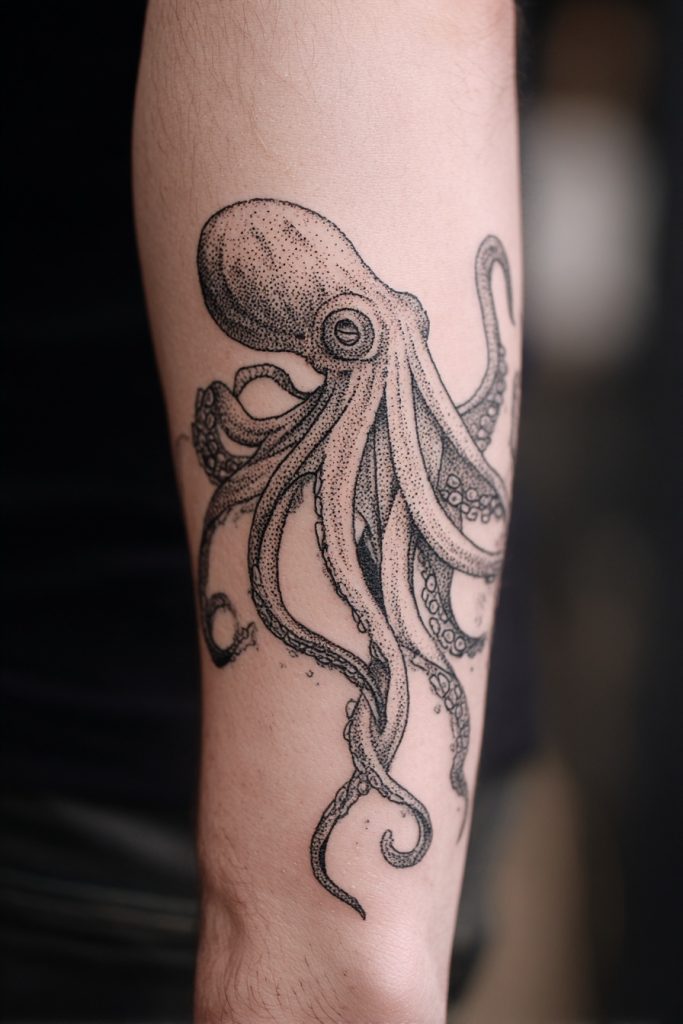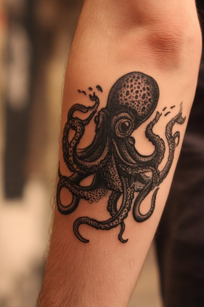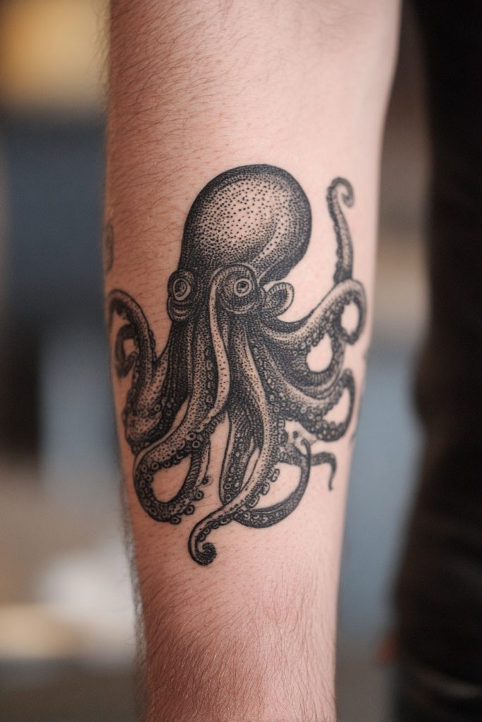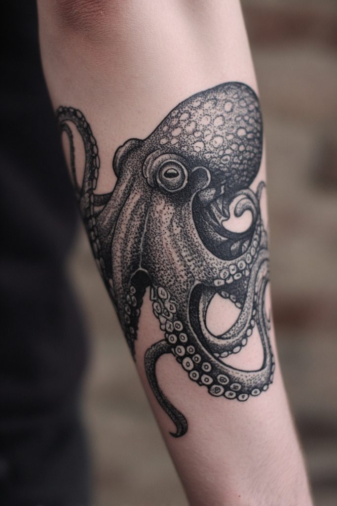 Dotwork tattoos use thousands of tiny, precise dots to create shading and depth, resulting in a design that feels incredibly textured and almost vibrating with energy. When applied to an octopus, this technique can create a mesmerizing effect that mimics the way light filters through the deep water onto the creature’s skin. This style requires a great deal of patience from both the artist and the wearer, symbolizing a commitment to the long-term process of growth and self-improvement. The meditative quality of the dots represents the idea that our lives are built out of small, consistent moments that eventually form a beautiful and complex whole. A dotwork octopus is a sophisticated and highly artistic piece that rewards close inspection and reflects your own attention to the fine details of your life.