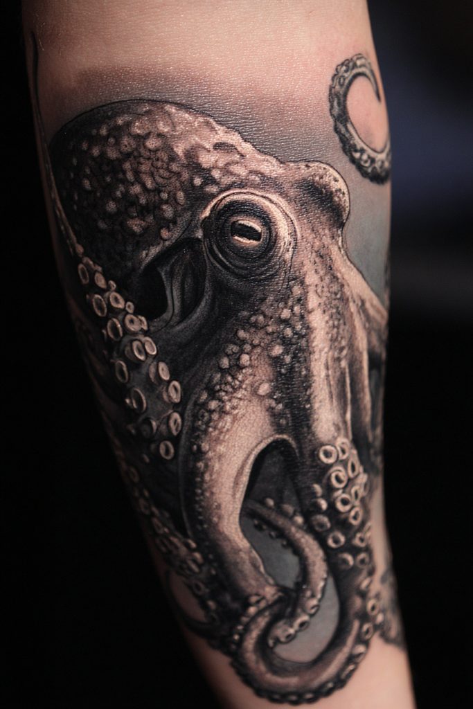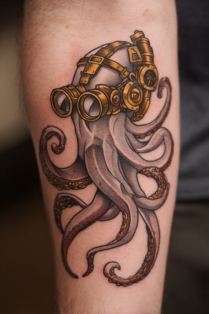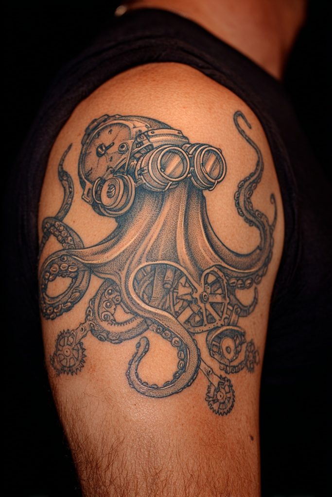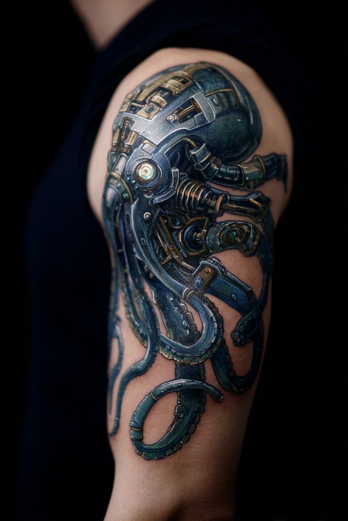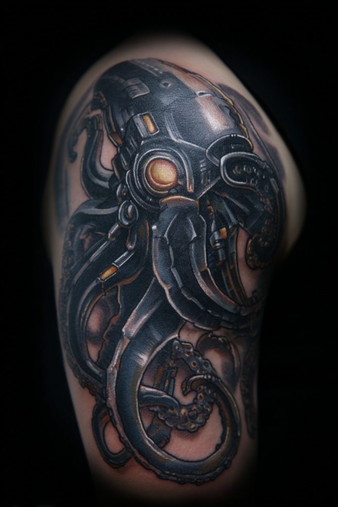 A bio-mechanical octopus tattoo reimagines the creature as a highly advanced biological machine, blending its organic tentacles with metallic pistons, glowing wires, and intricate gears. This design symbolizes the peak of adaptability, suggesting that the wearer has upgraded their own internal systems to handle the pressures and complexities of the modern world. It is a powerful metaphor for the way we integrate technology and logic into our primal instincts to survive and thrive in a fast-paced environment. This style is often rendered in dark, metallic tones with sharp highlights, giving it a gritty and formidable aesthetic that commands attention. It is a bold choice for someone who identifies with the idea of constant mental and physical evolution, pushing the boundaries of what is possible through sheer force of will.