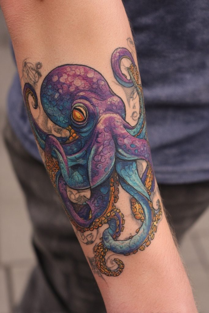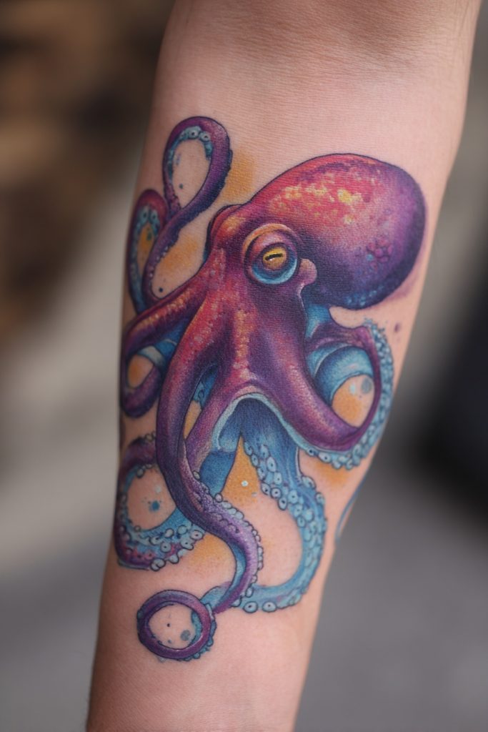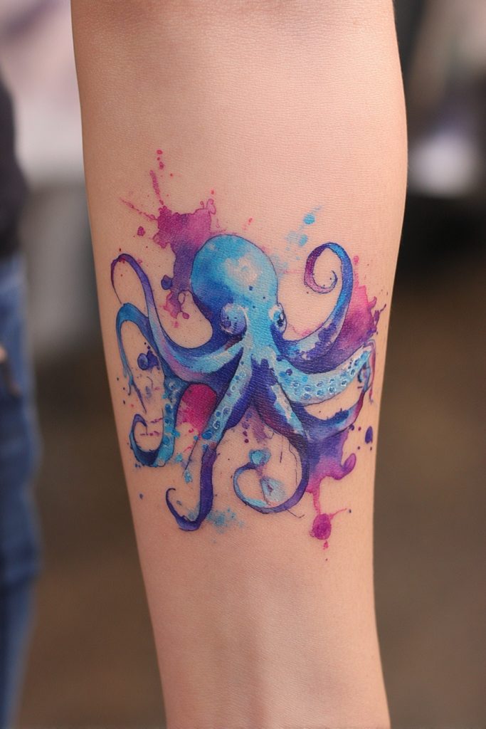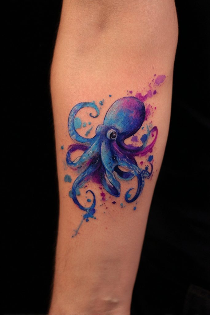 The watercolor tattoo style is a perfect match for the octopus because it mirrors the creature’s natural ability to release clouds of ink as a way to navigate through its environment. By using splashes of bright blues, purples, and magentas that bleed into one another, you can create a design that feels fluid, artistic, and full of life. This approach symbolizes the beauty of letting go and allowing your emotions to flow freely without the constraints of rigid lines or expectations. It is a celebration of the creative spirit and the idea that we are all works of art in progress, constantly changing our colors and shapes to fit the moment. A watercolor octopus is a visually stunning way to express your own sense of freedom and your refusal to be pinned down by a single definition.