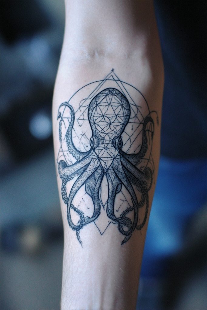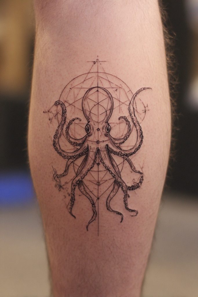 Integrating sacred geometry into an octopus design adds a layer of intellectual and spiritual depth to the symbol, suggesting that the creature’s intelligence is part of a larger universal order. By using patterns like the Flower of Life or the Fibonacci spiral within the mantle or the tentacles, you highlight the mathematical perfection that exists within nature’s most mysterious inhabitants. This style represents a bridge between the wild, unpredictable nature of the ocean and the structured, logical side of the human mind. It is a perfect choice for someone who values both intuition and reason, seeing the world as a complex tapestry of interconnected patterns. A geometric octopus tattoo is a sophisticated statement about your belief in the underlying harmony of the universe, even in the midst of the deep-sea shadows.