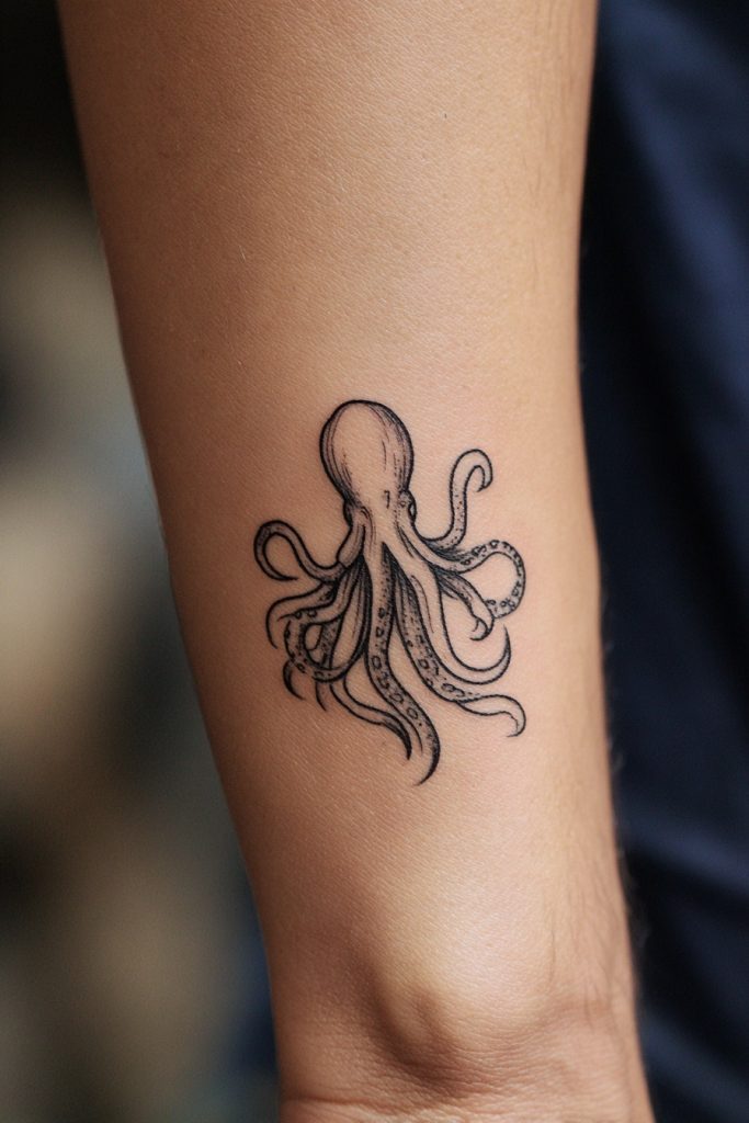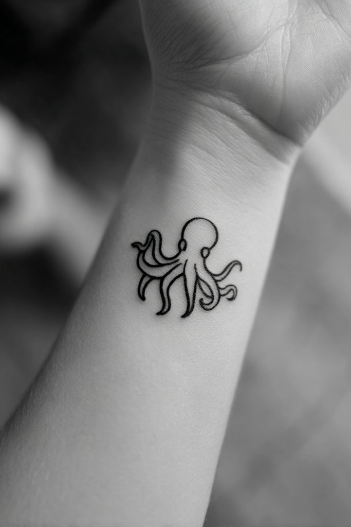 Sometimes the most profound statements are made with the smallest amount of ink, and a minimalist fine-line octopus can be exceptionally elegant and moving. By focusing on the graceful silhouette of the creature and the sweeping curves of its tentacles, you create a piece that feels light and ethereal. This style is ideal for those who prefer a more subtle and private connection to their ink, representing a quiet strength that does not need to be loud to be effective. It suggests that you possess a hidden power and a sharp intelligence that you only reveal when the time is absolutely right. A minimalist octopus is a sophisticated choice that can fit perfectly on a wrist, an ankle, or behind the ear, acting as a secret reminder of your own tenacity.