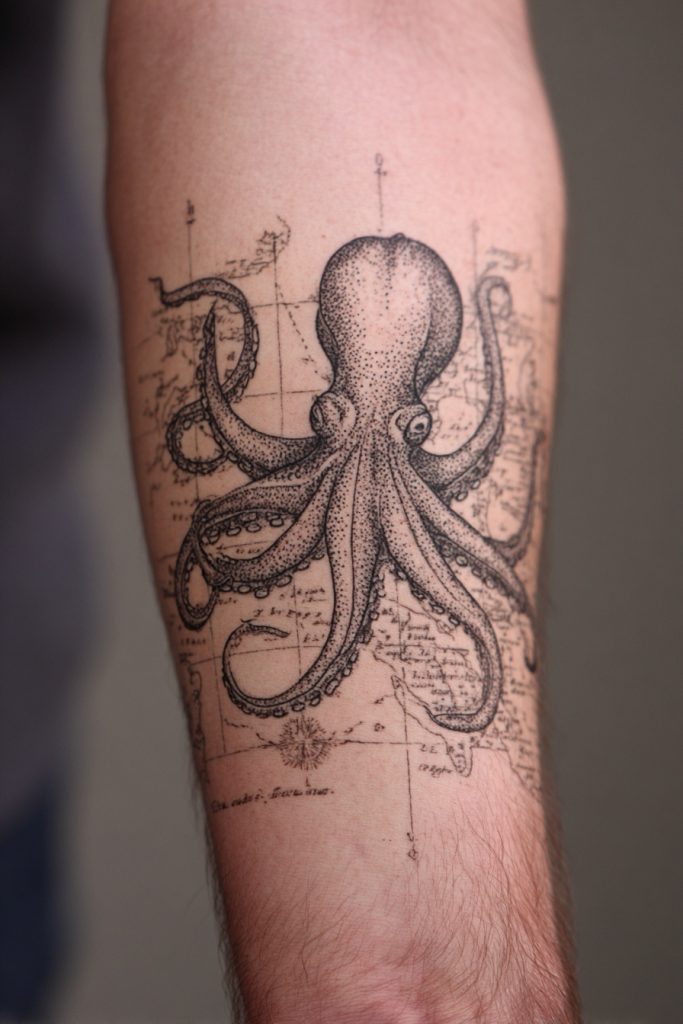 The woodcut or etching style of tattooing uses fine hatch marks and stippling to mimic the look of an old maritime map or a scientific illustration from a bygone era. These designs have a timeless, academic feel that suggests a deep love for history, exploration, and the pursuit of knowledge. An octopus rendered in this style feels like a relic pulled from a lost captain’s log, representing the enduring mystery of the sea and the courageous spirits who have sought to understand it. This approach is perfect for those who view their life as a great voyage of discovery, where every experience is a new piece of data to be recorded and understood. It is a classic and intellectually stimulating way to honor the legacy of the cephalopod and your own quest for wisdom.