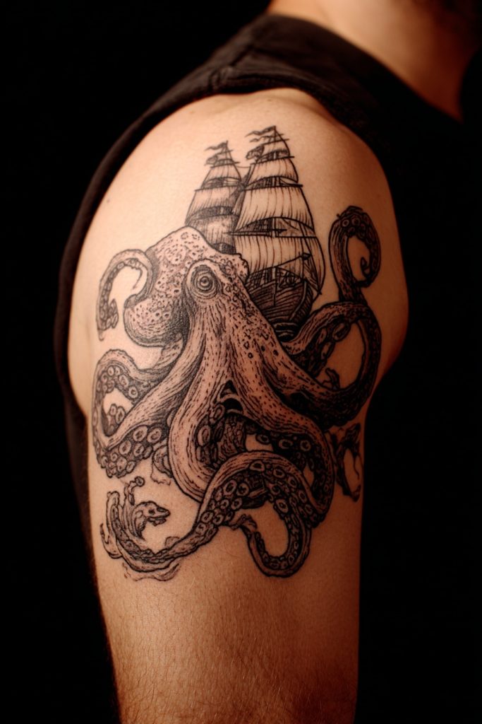 For those who are drawn to the darker and more formidable side of the octopus, a tattoo depicting the legendary Kraken is the ultimate symbol of power and dominance. This design often features the creature in the act of pulling down a massive ship or battling other monsters of the deep, representing the overwhelming forces of nature and the psyche. The Kraken symbolizes the parts of ourselves that are untamed, powerful, and capable of creating massive shifts in our environment when we are pushed to our limits. It is a badge of honor for someone who has faced their own internal demons and emerged as the master of their own fate. Wearing the Kraken is a way to acknowledge the destructive and creative power that you carry within you, reminding you that you are a force to be reckoned with.