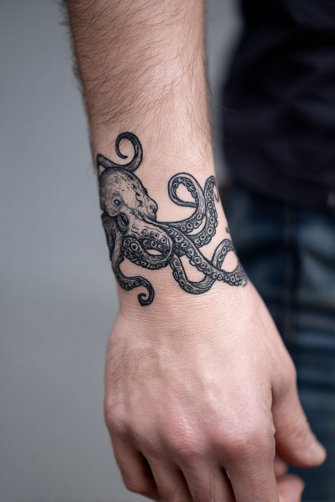 A single-tentacle wrap is a unique and highly dynamic tattoo choice that uses the natural anatomy of your body to bring the design to life. Instead of showing the entire creature, this style focuses on one or two tentacles that wind around your forearm, leg, or torso, disappearing and reappearing in a way that suggests the rest of the octopus is just out of sight. This creates a sense of intrigue and playfulness, symbolizing the idea that you are only showing a fraction of your true potential to the world. The kinetic energy of the wrap makes the tattoo feel as if it is moving with you, emphasizing your own agility and your ability to reach out and grab the opportunities that come your way. It is a modern and clever take on the octopus theme that feels both stylish and deeply personal.