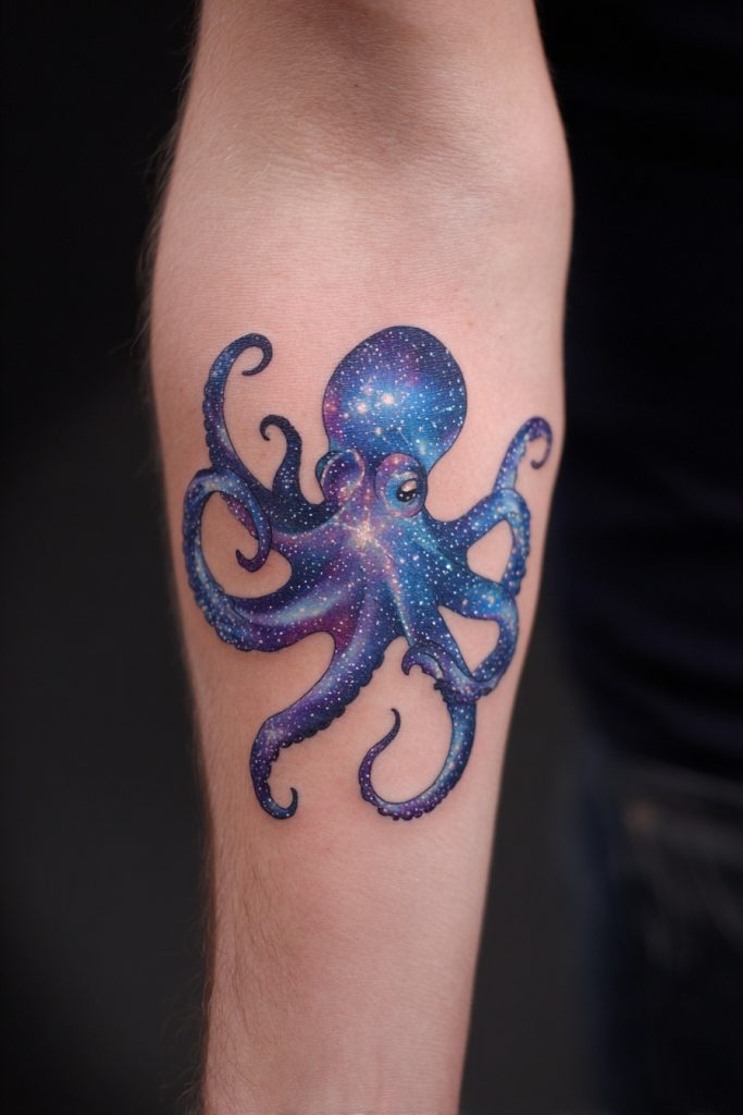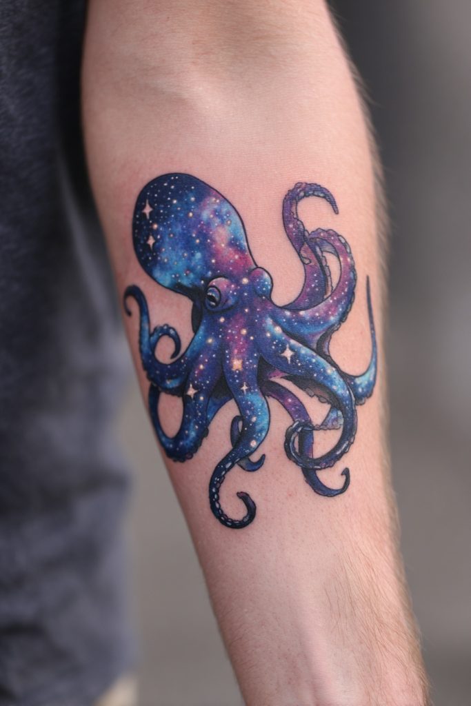 The octopus has a look that is often described as extraterrestrial, and a celestial-themed tattoo leans into this idea by filling the creature’s form with stars, nebulae, and swirling galaxies. This style symbolizes the vastness of the mind and the idea that we are all made of stardust, connected to the mysterious reaches of the cosmos. It represents an expansive way of thinking where you are not limited by the boundaries of the earth, but are instead a citizen of the entire universe. The deep blues and vibrant purples of the space-themed ink contrast beautifully with the alien shape of the octopus, creating a piece of art that feels truly out of this world. It is a perfect choice for the dreamer and the philosopher who finds inspiration in the infinite possibilities of the unknown.