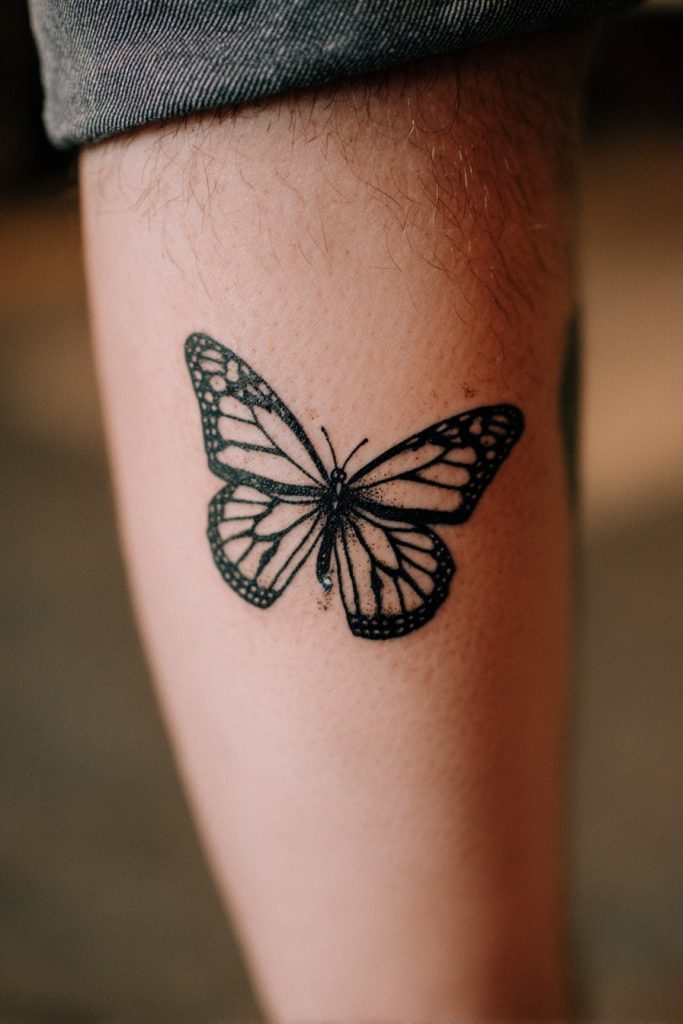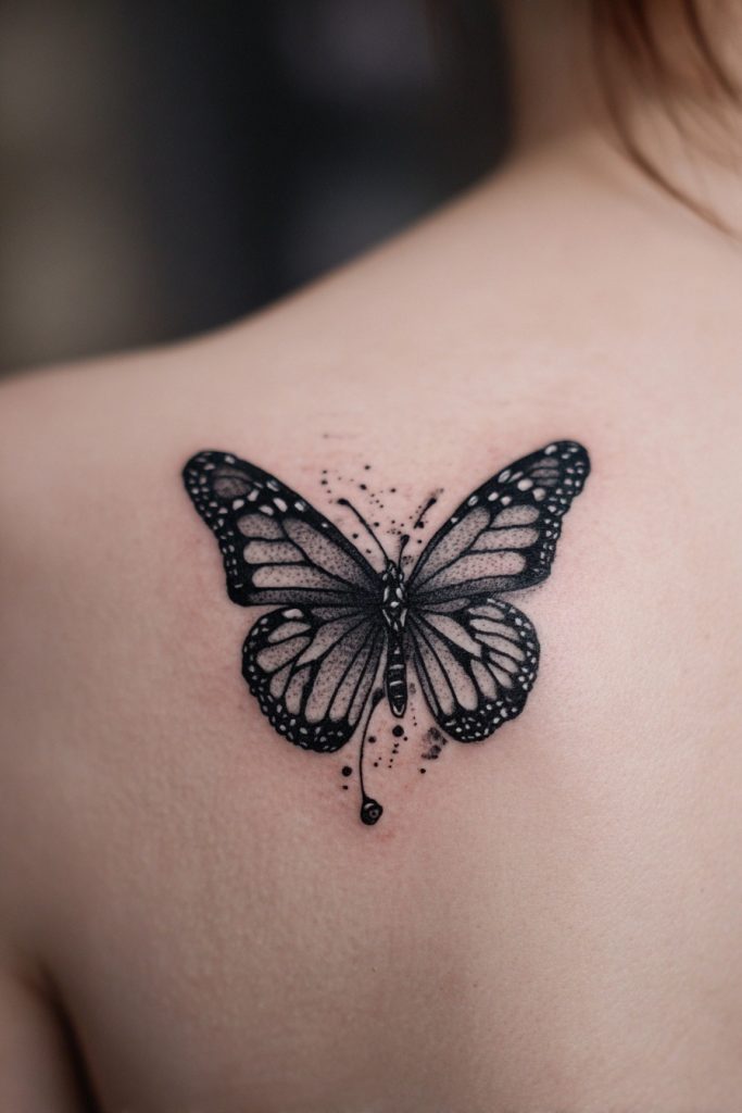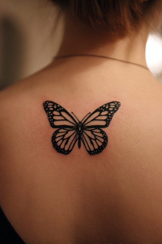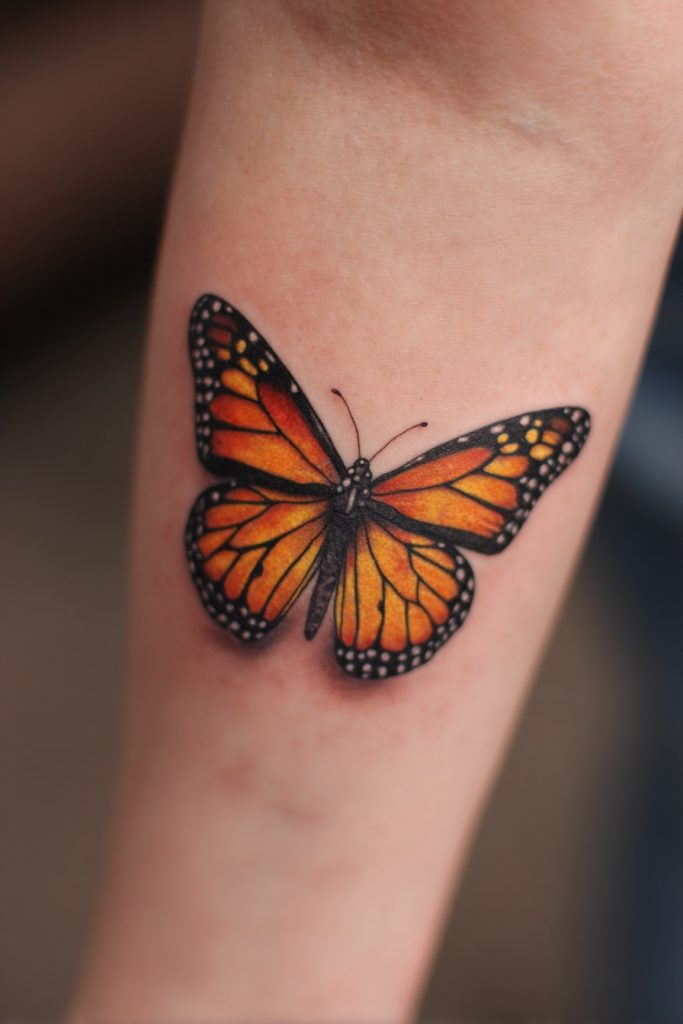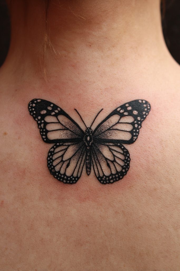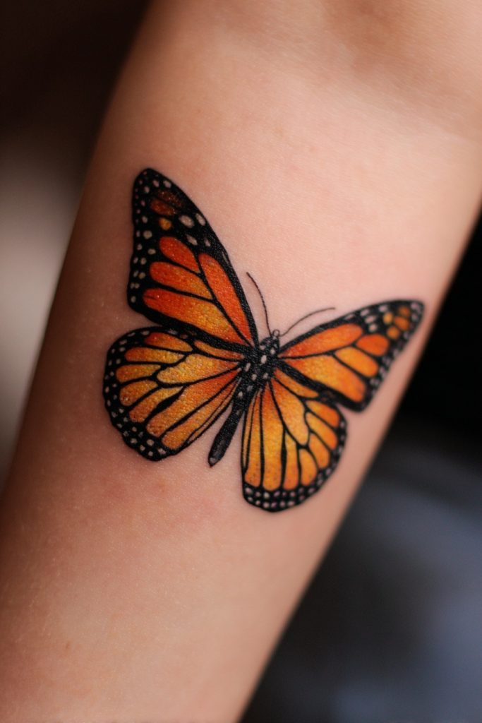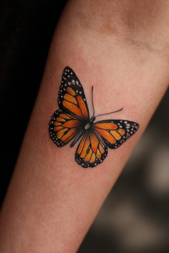 A large, symmetrical monarch placed on the center of the chest or between the shoulder blades is a bold statement of balance and self-possession. The natural symmetry of the butterfly makes it an ideal subject for these placements, as the wings can follow the contours of the body perfectly. This design often feels like a protective shield or a set of wings that belong to the person wearing the tattoo, suggesting that they have fully embraced their own power and potential. It is an empowering choice that represents a soul that is ready to take flight and claim its place in the world. The sheer scale of a piece like this allows for an incredible level of artistic detail, from the tiny white spots on the wing borders to the subtle textures of the butterfly’s body. It is a true masterpiece that honors the royal status of the monarch.