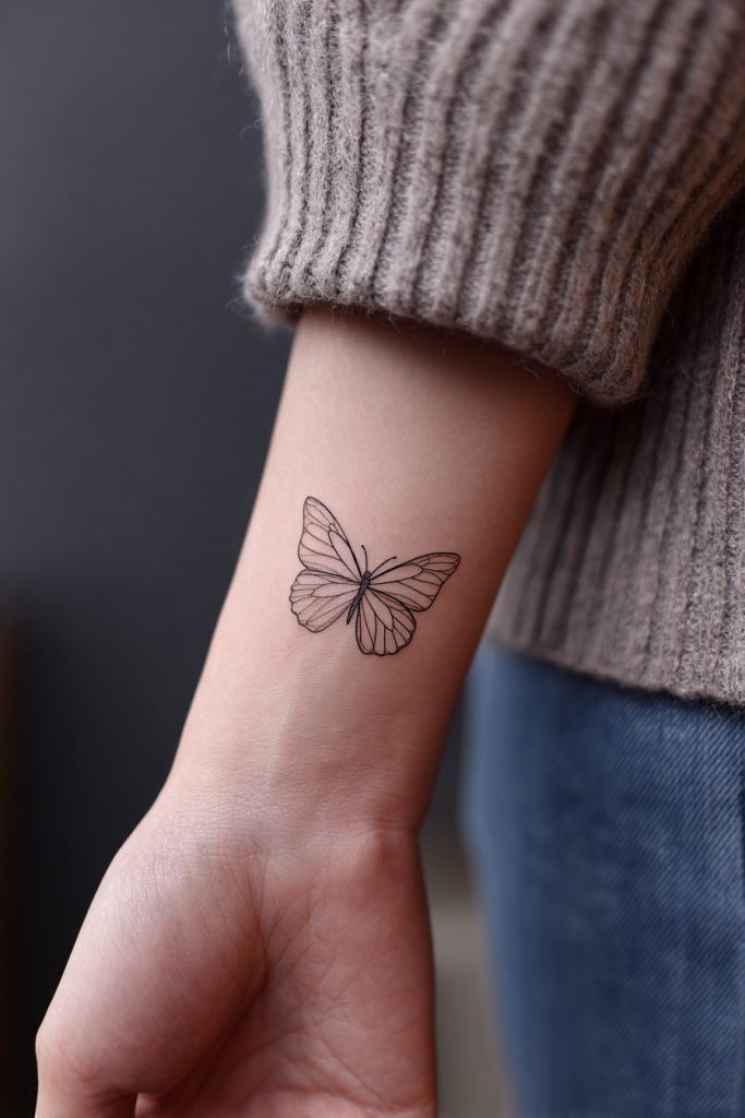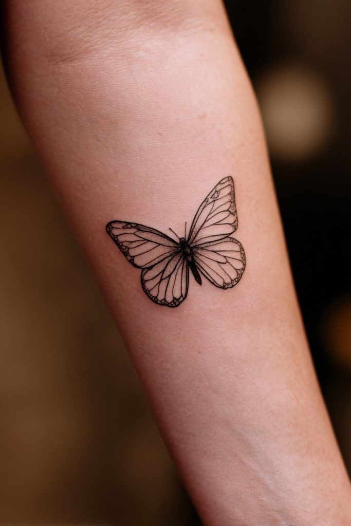 For those who prefer a more subtle and modern aesthetic, a minimalist fine-line monarch offers a delicate interpretation of this powerful symbol. This design focuses on the essential shape of the butterfly, using thin, precise lines to evoke the feeling of flight without the heavy saturation of color. It is a perfect choice for placements like the inner wrist, the collarbone, or behind the ear, where a smaller piece can make a significant impact. This style represents the idea that transformation is often a quiet and internal process that doesn’t always need to be loud to be meaningful. The simplicity of the design allows the viewer to focus on the grace of the form, making it a timeless piece of art that complements any personal style. It is a quiet nod to growth and the beauty found in life’s most delicate moments.