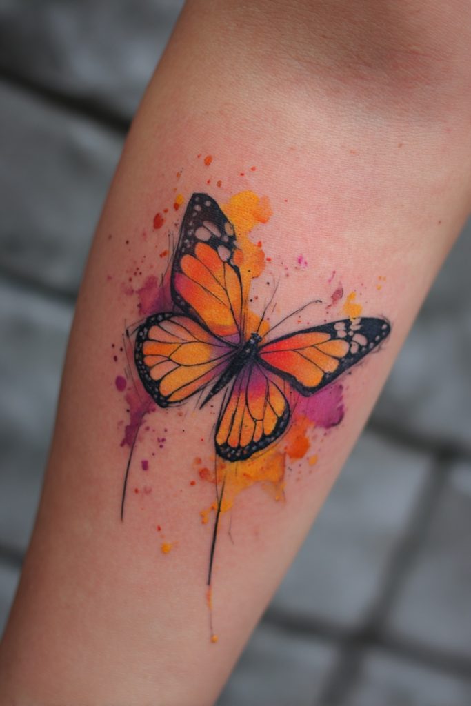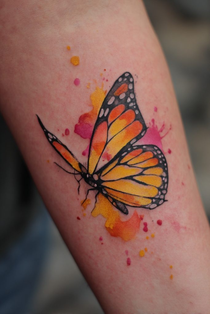 A watercolor monarch tattoo is a celebration of fluidity, creativity, and the messy but beautiful process of change. Instead of staying strictly within the black outlines, the vibrant oranges and yellows bleed into the surrounding skin like a fresh painting. This artistic approach suggests that our personal growth is not always contained or predictable, but it is always full of life and color. It is an excellent choice for someone who views their life as a work in progress and isn’t afraid to embrace the unconventional. The soft edges and bright splatters create a sense of movement, as if the butterfly is in the middle of a joyful flight. This style is visually captivating and serves as a reminder that even when things feel chaotic, there is a larger, beautiful pattern emerging from the colors of our experiences.