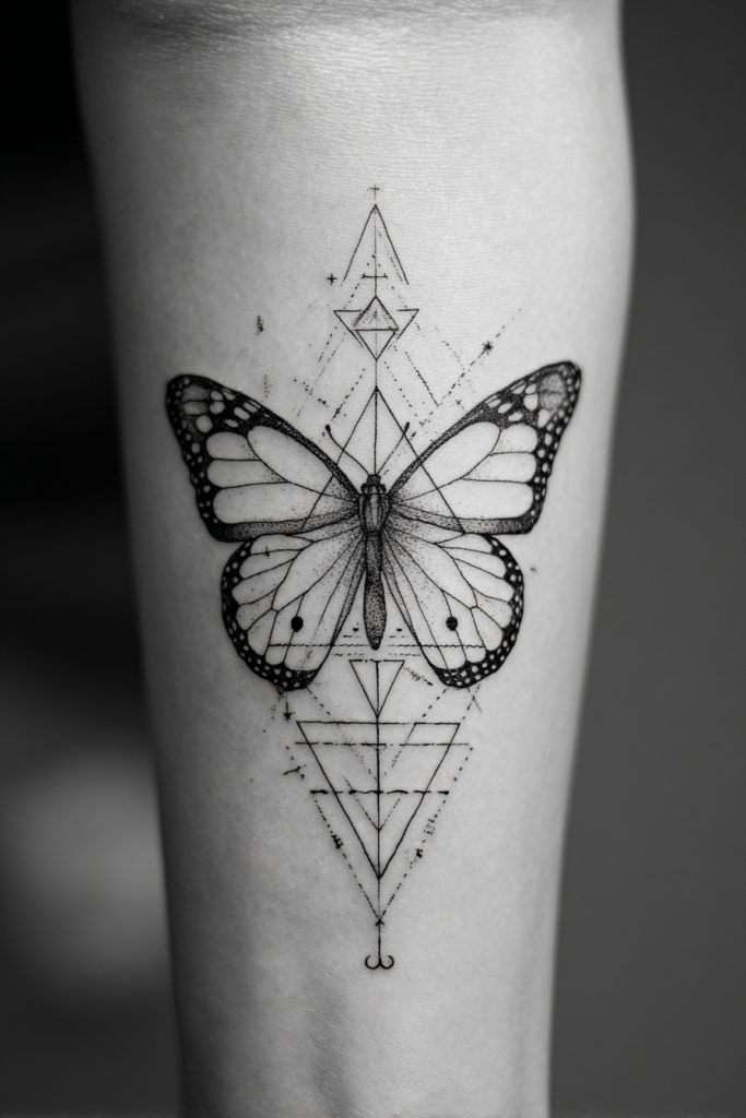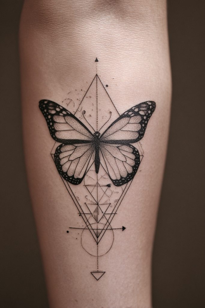 Combining the organic curves of a butterfly with the rigid structure of geometric shapes creates a fascinating contrast that speaks to the balance between nature and logic. This design might feature a monarch bisected by a series of triangles, circles, or sacred geometry patterns, suggesting that there is a mathematical beauty behind the chaos of transformation. It is a popular choice for those who find comfort in order and want to represent their personal growth as a structured and intentional journey. The sharp lines provide a modern frame for the butterfly’s wings, making the tattoo feel like a sophisticated piece of graphic art. This fusion of styles represents the harmony between the heart and the mind, showing that true evolution requires both emotional depth and a solid foundation of self-awareness.
