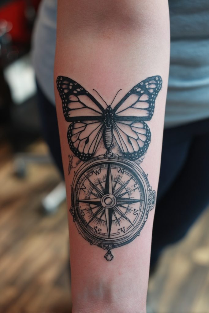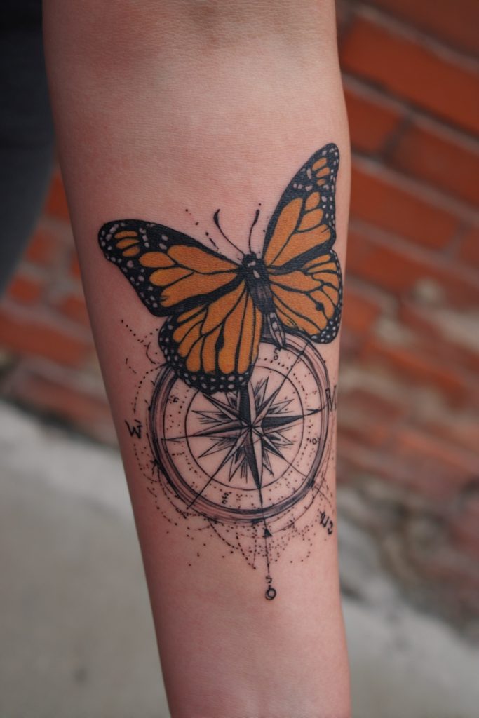 For the traveler or the seeker, pairing a monarch butterfly with a compass is a powerful way to represent guidance and the long journey home. The monarch is famous for its multi-generational migration, an incredible feat of navigation that mirrors our own search for purpose and direction. This tattoo is a beautiful tribute to the idea that no matter how far we wander, we have an internal compass that leads us toward our true selves. It is a favorite for those who have moved far from their birthplace or who have embarked on a significant life transition. The intricate details of the compass dial provide a sturdy, adventurous backdrop for the delicate butterfly, creating a design that feels both adventurous and deeply grounded. It is a reminder that the journey itself is just as important as the destination.