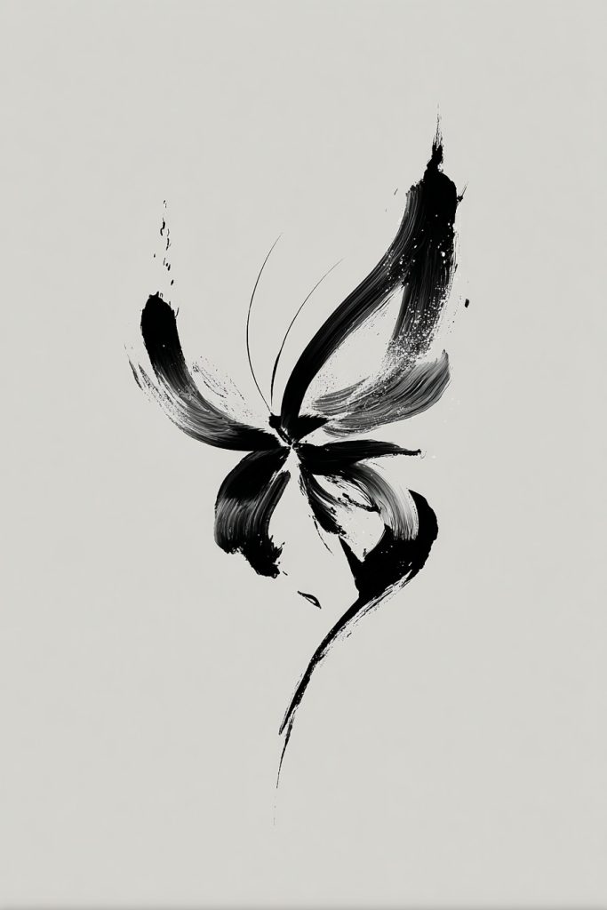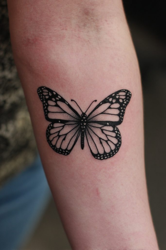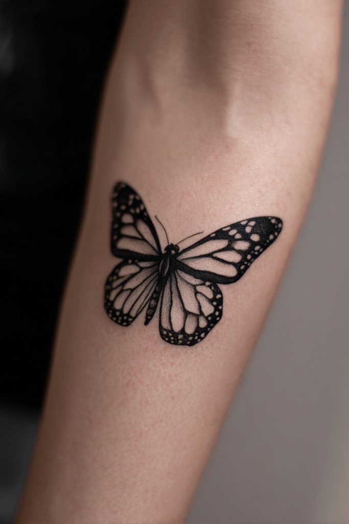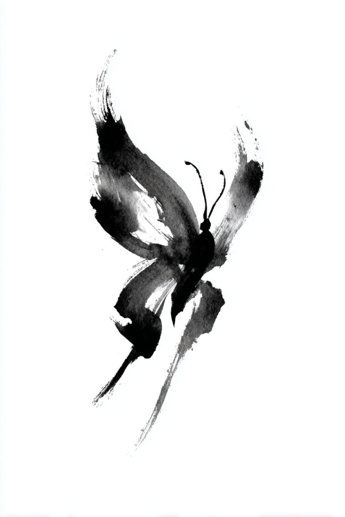 An abstract monarch created with bold, black brushstrokes resembles a piece of traditional calligraphy or a modern ink wash painting. This style focuses on the movement and energy of the butterfly rather than the literal details of its anatomy. It is a sophisticated and artistic choice that appeals to those who appreciate the ‘essence’ of a thing over its outward appearance. The lack of bright color makes the design feel more serious and grounded, while the fluid lines ensure it still feels light and airy. This tattoo represents a more philosophical approach to transformation, suggesting that the spirit of change is a powerful, flowing force that moves through us. It is a unique way to interpret a popular symbol, making it stand out as a truly original piece of body art that celebrates the mystery of the natural world.