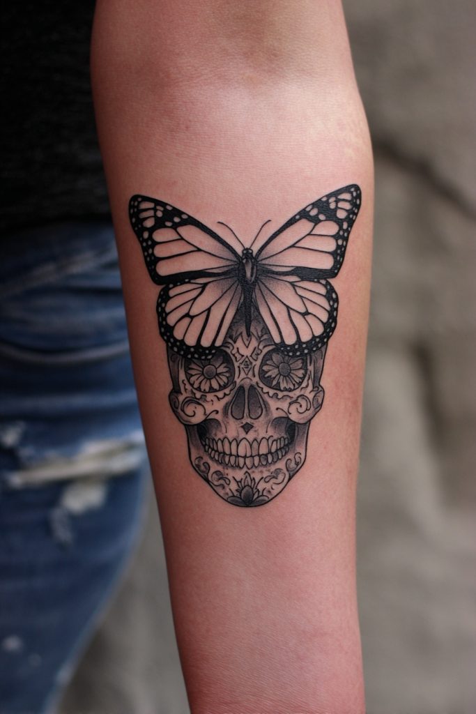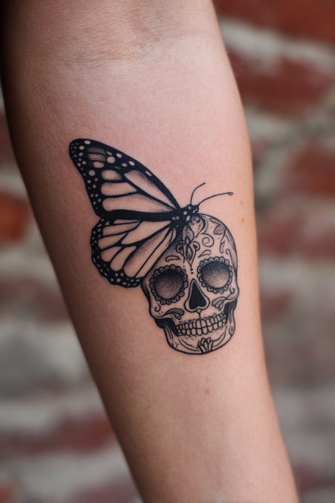 In many traditions, particularly during Day of the Dead celebrations, the monarch butterfly is seen as the literal embodiment of the souls of the departed returning to visit their loved ones. Pairing a monarch with a beautifully decorated sugar skull or a realistic skull creates a profound piece of art that explores the cycle of life, death, and rebirth. This design is not intended to be macabre; rather, it is a celebratory and respectful tribute to those who have passed on. It suggests that death is simply another form of metamorphosis and that the love we have for our ancestors continues to flutter in our hearts. The contrast between the fragile butterfly and the solid bone creates a visually stunning and philosophically deep tattoo that honors the enduring connection between the living and the spirit world.
