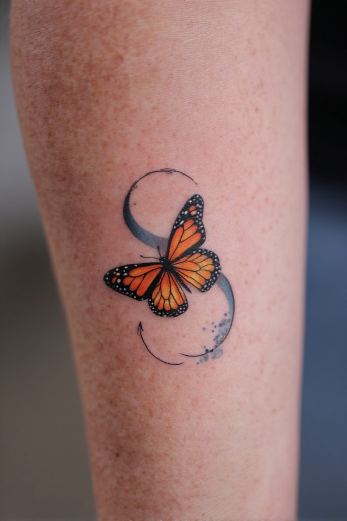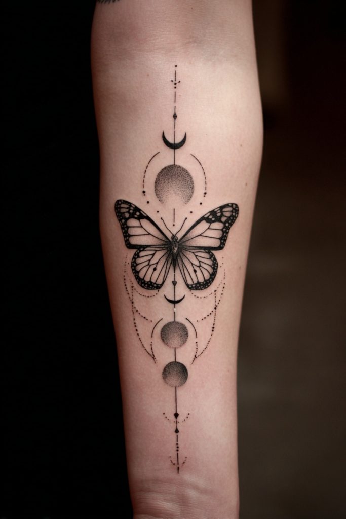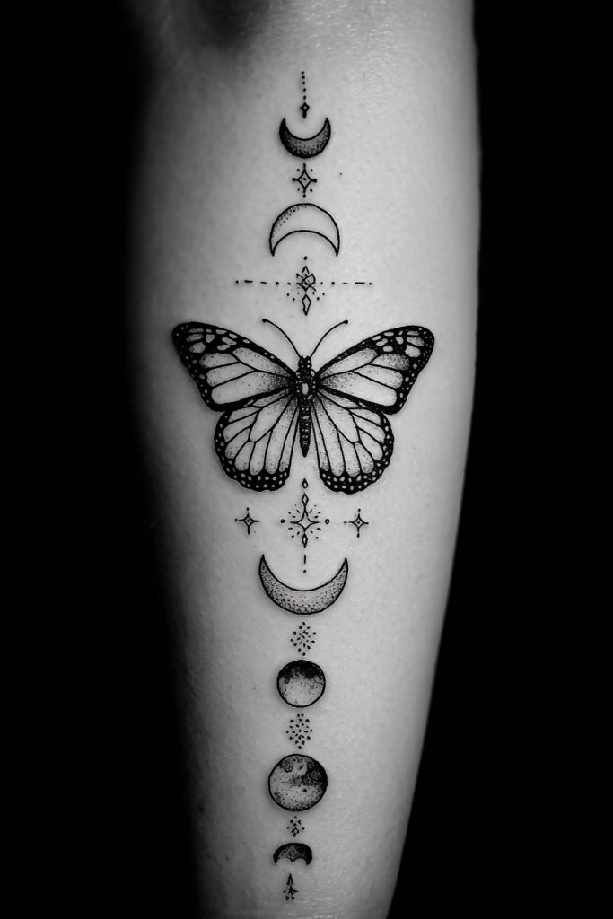Combining a monarch butterfly with the phases of the moon creates a celestial design that speaks to the divine timing of our lives. The moon represents the cycles of time, intuition, and the constant ebb and flow of our emotions, while the butterfly represents the physical transformation that happens within those cycles. Together, they suggest that our growth is guided by a larger, cosmic rhythm and that there is a right time for every stage of our development. This tattoo is often designed vertically, with the butterfly at the center of the lunar progression, creating a balanced and mystical aesthetic. It is a favorite for those who feel a deep connection to the night sky and who trust in the process of life’s unfolding. This piece serves as a reminder that even when we are in the ‘dark’ phases of our journey, we are still moving toward a full and vibrant expression of our true selves.