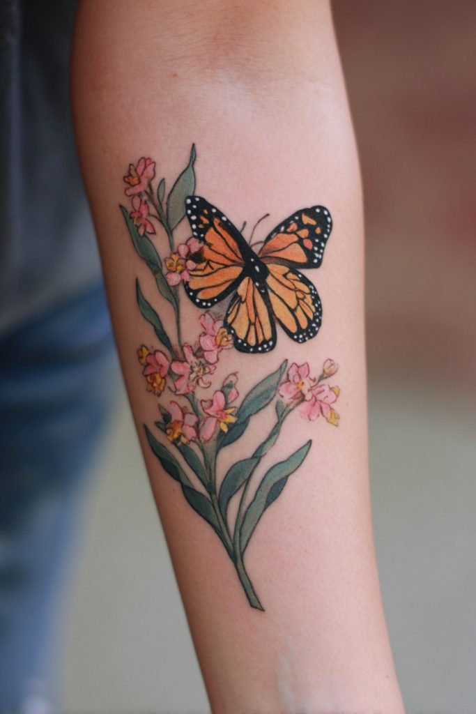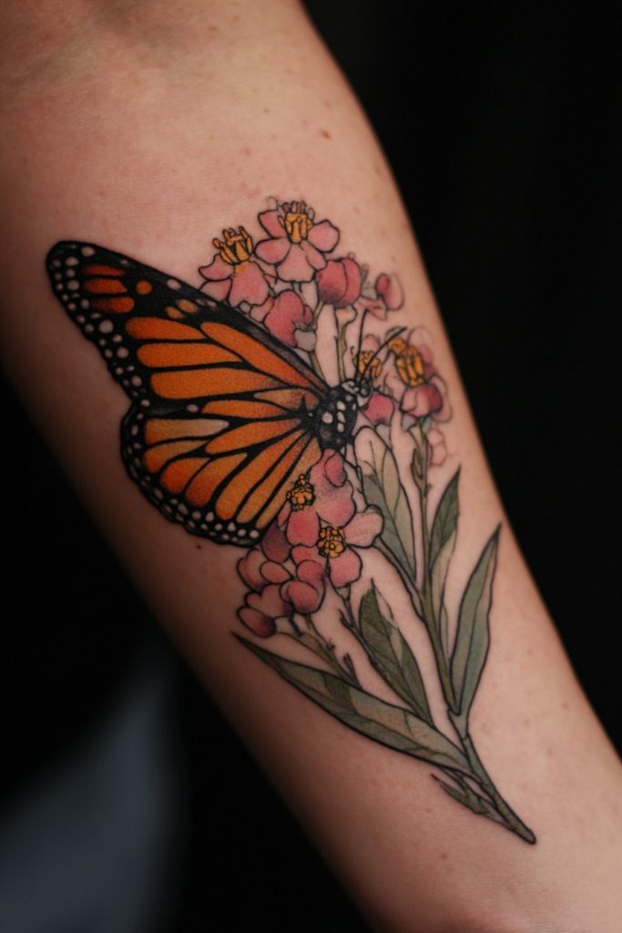 Monarchs have a unique and vital relationship with the milkweed plant, which is the only food source for their caterpillars. A tattoo that features a monarch resting on a sprig of milkweed or surrounded by its flowers is a beautiful nod to the importance of our environment and the things that nourish us. It represents the idea that for us to grow and thrive, we must stay connected to our roots and find the specific ‘nutrients’ that feed our souls. This design is often lush and colorful, incorporating greens and soft pinks alongside the bold orange of the butterfly. It is a perfect choice for nature lovers or gardeners who want to celebrate the interconnectedness of all living things. This piece serves as a reminder to take care of the world around us, as it is the foundation upon which all our transformations are built.