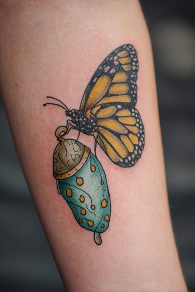 Most butterfly tattoos focus on the final, winged form, but a design that shows the monarch emerging from its chrysalis is a powerful tribute to the struggle and effort of becoming. This piece captures the vulnerable moment of transition where the old self is gone but the new self is still unfurling. It is a deeply resonant choice for anyone who has worked hard to reinvent themselves or who is currently in the middle of a difficult but necessary change. The chrysalis, often rendered in a soft green with gold spots, provides a beautiful contrast to the damp, vibrant wings of the emerging monarch. This tattoo celebrates the courage it takes to be vulnerable and the incredible patience required for a true metamorphosis. It is a reminder that the most beautiful parts of ourselves are often forged in the quiet, hidden spaces of our lives.