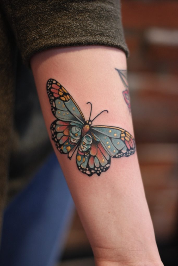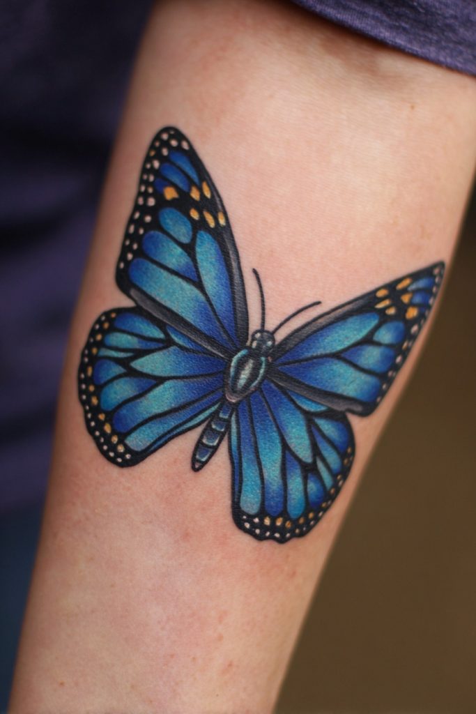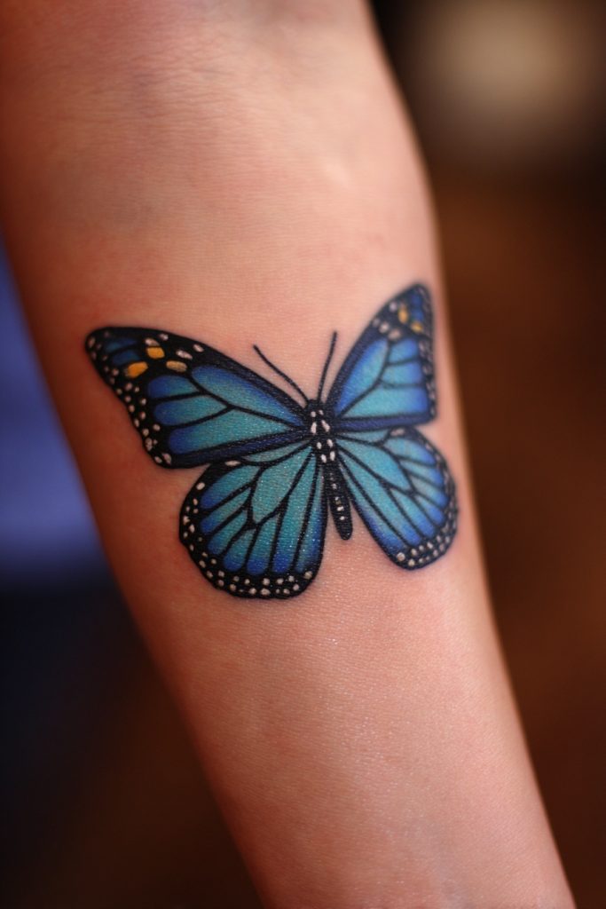 While the classic monarch is orange, many people choose to get a ‘blue monarch’ tattoo to represent a sense of rarity, uniqueness, and fantasy. In the world of ink, a blue butterfly often symbolizes high honor, good fortune, and the attainment of a dream that once seemed impossible. By using the monarch’s distinctive wing pattern but swapping the orange for deep blues and teals, you create a design that feels magical and otherworldly. This choice is perfect for someone who feels like they don’t quite fit into the traditional mold and who prides themselves on their individuality. It represents a transformation that is not just a change in form, but a total elevation of the spirit into something extraordinary. This tattoo is a striking and vibrant way to celebrate your own unique light and the rare beauty of your personal journey.