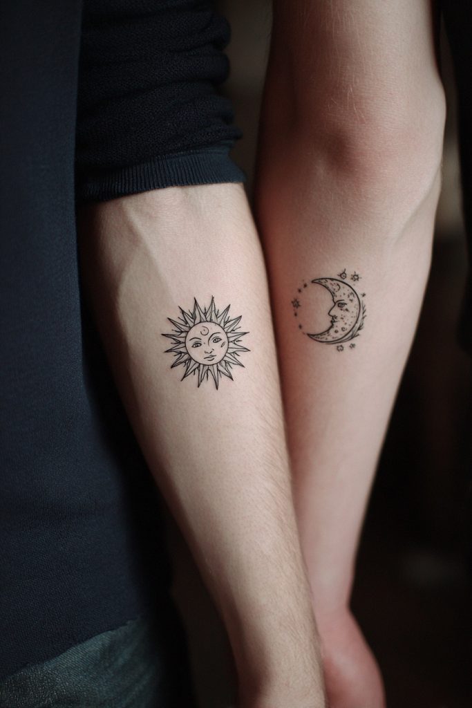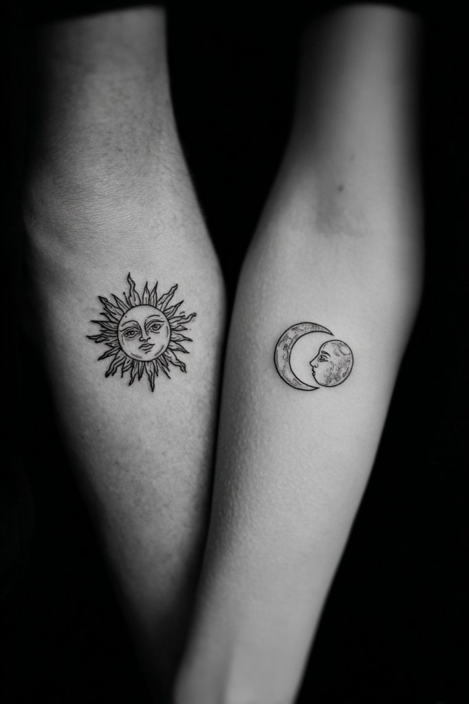 The sun and moon represent the fundamental balance of opposites, symbolizing how two distinct personalities can come together to create a harmonious whole. One partner might wear the sun to represent vitality and warmth, while the other carries the moon to symbolize intuition and the quiet strength of the night. Together, they signify that the relationship is complete across all hours and seasons, acknowledging that every light needs a shadow to be fully understood. This design is perfect for couples who feel they complement each other’s strengths and weaknesses, creating a celestial partnership that feels as ancient and inevitable as the tides. The simple, circular forms of these celestial bodies allow for a clean, geometric look that fits perfectly in small spaces, offering a timeless aesthetic that celebrates the cosmic nature of your connection.