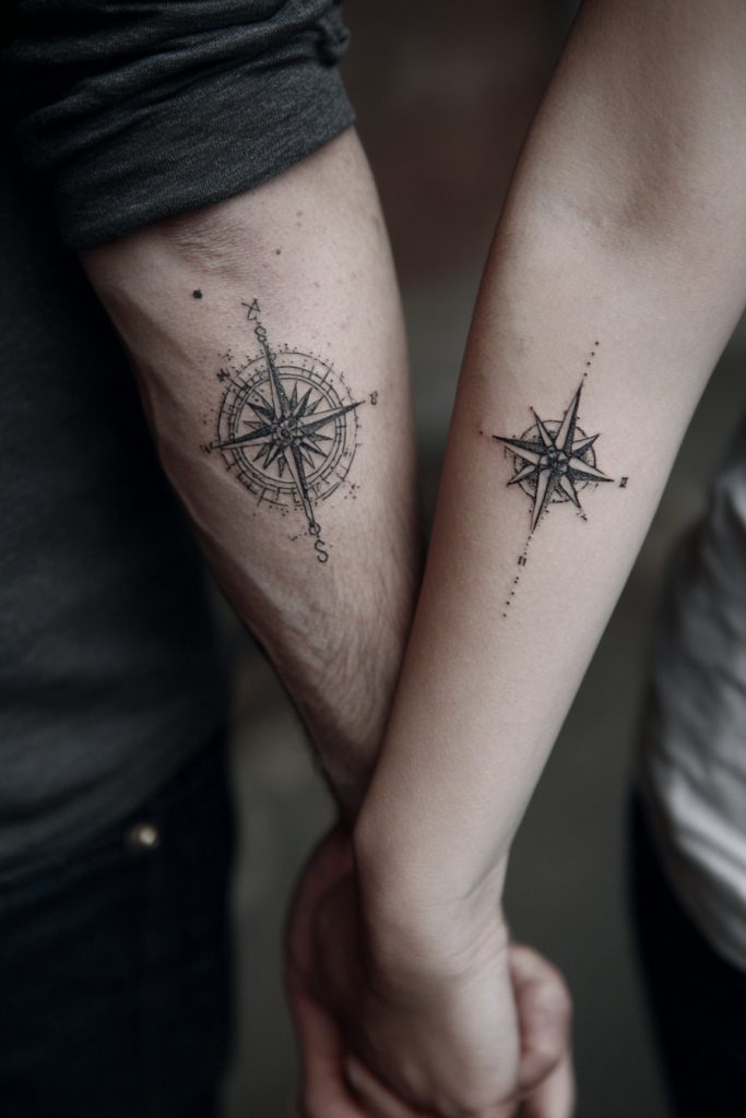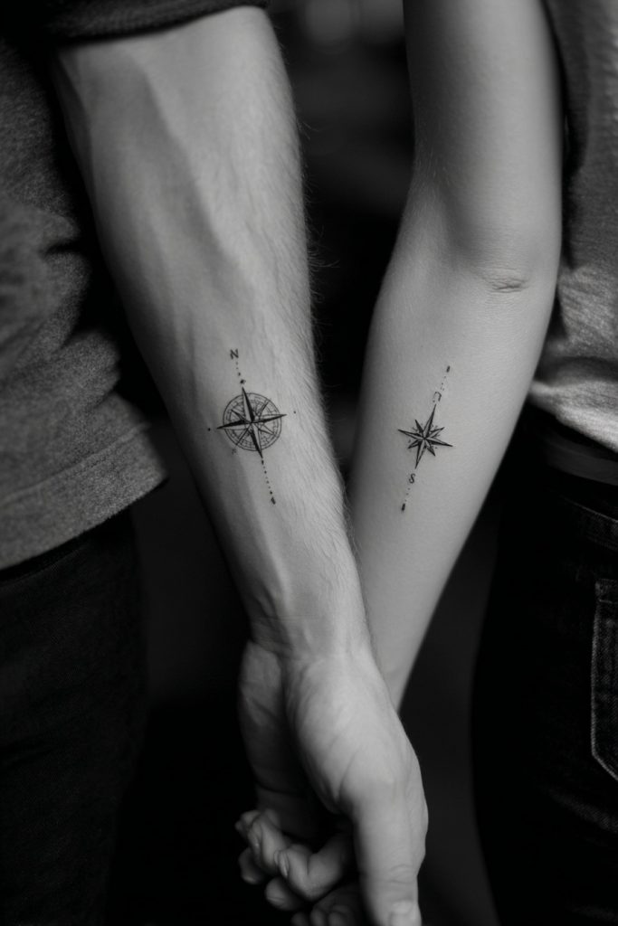 For couples who view their relationship as a guiding force in their lives, the compass and North Star are deeply symbolic choices. One person wears the compass, representing the journey and the search for direction, while the other carries the North Star, symbolizing the fixed point that always leads them back home. It is a beautiful way to acknowledge that no matter how far apart you may be physically or how chaotic life becomes, your partner remains your ultimate orientation. This design often resonates with those who love to travel or who have navigated significant challenges together, serving as a permanent reminder that you are each other’s safe harbor. The fine lines of a compass needle paired with the delicate sparkle of a star create a sophisticated, nautical-inspired look that is both stylish and profoundly meaningful.