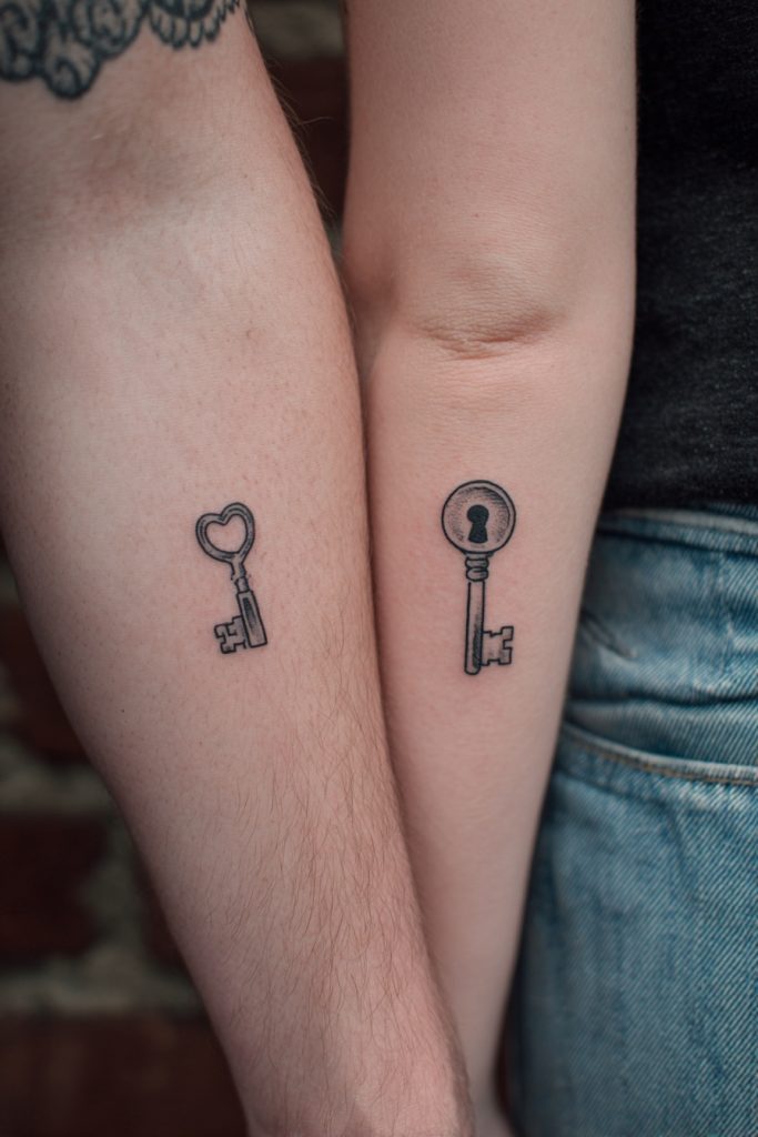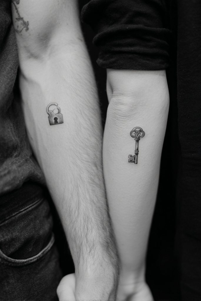 The lock and key motif is a classic representation of the idea that one person holds the unique access to the other’s heart. In a contemporary tattoo context, these designs are often stripped down to their most basic, iconic shapes to maintain a subtle and stylish appearance. One partner might have a tiny, vintage-style keyhole, while the other carries the matching key. This signifies a deep level of trust and the understanding that your emotional world is uniquely safe with your partner. It is a playful yet serious acknowledgment of the exclusivity and security found within a healthy relationship. By choosing a small, fine-line version of this concept, you create a piece of art that feels like a shared secret, symbolizing that you have found the one person who truly understands and unlocks your best self.