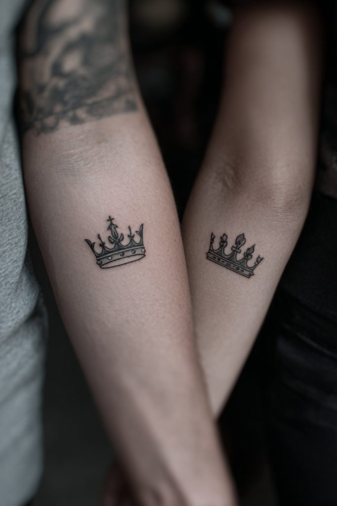 While crowns can sometimes be large and ornate, a minimalist version focusing on the basic silhouette of a king and queen crown is a sophisticated way to represent mutual respect and partnership. It signifies that you view each other as equals who are building a life, or an ’empire’, together. This design is less about hierarchy and more about the dignity and honor you bestow upon one another within the relationship. It represents a commitment to protecting and providing for each other, creating a space where both partners feel valued and empowered. A tiny, fine-line crown on the side of the hand or the collarbone acts as a subtle badge of loyalty, reminding you that in the world you have built together, you are each other’s most important priority and greatest source of pride.